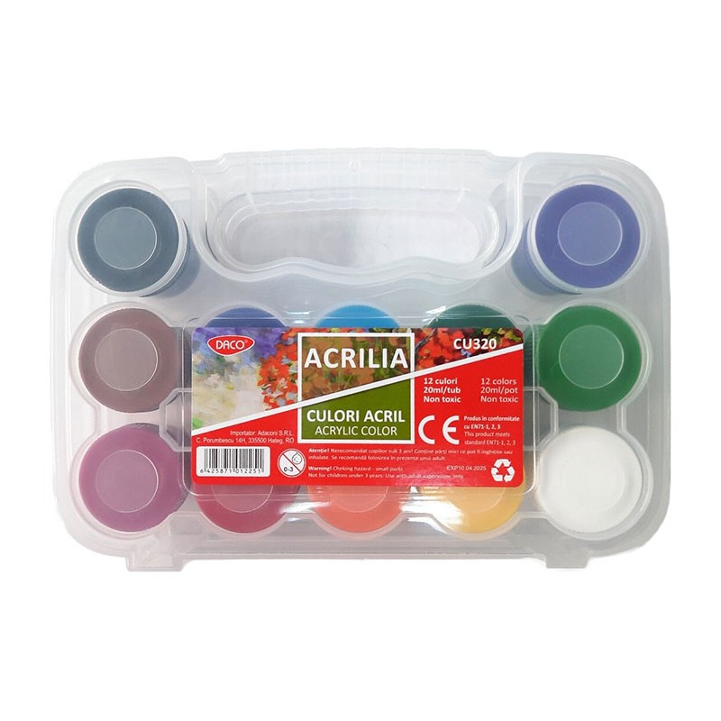 Culorile acrilice sunt recunoscute pentru uscarea rapida, flexibilitatea si capacitatea de a se amesteca si dilua cu usurinta. Indiferent de proiectul artistic, aceste culori ofera o gama larga de nu-ante vibrante si intense, potrivite pentru a fi aplicate pe diverse suporturi, inclusiv canvas, hartie, lemn si perete. Fiecare recipient con?ine 20 ml de vopsea acrilica de inalta calitate, suficient pentru a-ti indeplini orice vis artistic. Setul include 12 culori si nuante diferite, fiecare caracterizata de pigmenti puternici si intensi. Culorile sunt ambalate intr-o cutie de plastic practica si cocheta, care va pastra culorile intacte si organizate, astfel incat sa te poti bucura de libertatea de a picta oriunde si oricand. Mai mult, culorile sunt usor de curatat de pe haine si de pe majoritatea materialelor tex-tile, astfel incat sa te poti concentra pe arta si culoare, fara sa-ti faci griji pentru petele neplacute.