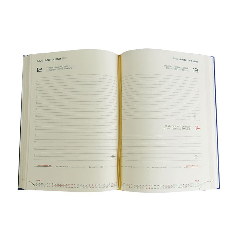 Agenda datata in format A5, pentru anul 2026, alegerea ideala pentru organizarea tuturor activitatilor importante pe parcursul unui an. Avand un design elegant si practic, aceasta agenda este potrivita atat pentru uz personal, cat si pentru uz profesional. Agenda contine un numar de 336 pagini pentru notite zilnice si harti pentru o mai buna orientare si planificare. Agenda este realizata din hartie de culoare ivory, cu un gramaj de 70g/mp, asigurand o experienta placuta la scriere si prevenind patrunderea cernelei in hartie. Copertile agendei sunt buretate, realizate din material lucios de foarte buna calitate, tip imitatie piele, oferind astfel un aspect profesional si o protectie suplimentara. Agenda este lipita si cusuta pe lateral, garantand surabilitate si o deschidere usora. Colturile de jos ale foilor sunt perforate. Agenda este structurata de urmatoarea maniera: pe primele pagini contine rubrica pentru datele personale, urmata de calendarul pentru anii 2026, 2027 si 2028, informatii despre ora pe glob, informatii telefonice, informatii despre statele member ale Uniunii Europene, prefixe telefonice si lista cu sarbatori religioase, iar la sfarsit contine sase pagini pe care se pot nota diverse informatii de contact, telefoane si adrese si trei harti color. Agenda este prevazuta cu un semn de carte de culoare galbena, pentru un acces rapid si usor la pagina dorita. Agenda are coperta de culoare albastru si elemente de design folio, detalii rafinate care adauga un plus de eleganta. Dimensiunile agendei sunt urmatoarele: 14.5x20.5 cm (format finit), astfel ca agenda este usor de transportat si de utilizat in orice situatie. Agenda A5 datata zilnic Arti Lux este un instrument esential pentru cei care doresc sa isi organizeze eficient timpul. Cu un stil sofisticat si functionalitate crescuta, aceasta agenda va deveni cu siguranta un partener de incredere in gestionarea zilnica a activitatilor.