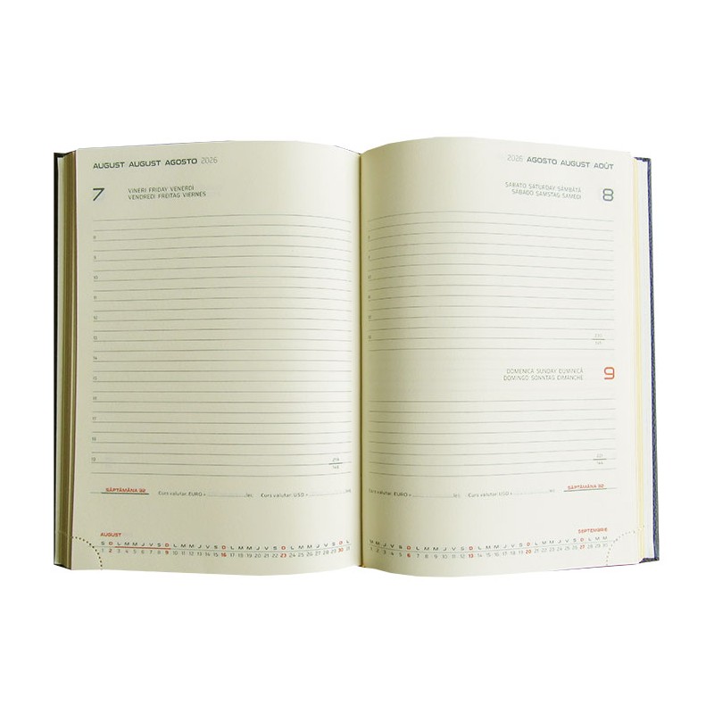 Agenda datata pentru anul 2026, disponibila in format A5, partenerul ideal pentru organizarea zilnica, in activitatile profesionale sau personale. Cu un design clasic si elegant, aceasta agenda este perfecta pentru a-ti pastra notitele, planurile si ideile intr-un mod ordonat si stilat. Agenda contine un numar de 352 pagini, asigurand astfel suficient spatiu pentru toate notitele tale im-portante. Agenda este realizata din hartie de culoare ivory, cu un gramaj de 70g/mp, ceea ce asig-ura o senzatie placuta la scris si asigura o experienta de inalta calitate. Foile agendei sunt aurite pe margine, pentru un aspect deosebit si elegant. Agenda este lipita si cusuta pe lateral. Finisarea cusuta si legata garanteaza durabilitate si o utilizare indelungata, iar semnul de carte integrat de culoare aurie, te va ajuta sa gasesti rapid pagina dorita. Agenda este structurata de urmatoarea ma-niera: pe prima pagina are rubrica pentru datele personale, calendarele pentru anii 2026, 2027 si 2028, 10 pagini ce contin diverse informatii (ora pe glob, informatii telefonice, statele membre ale Uniunii Europene, prefixe telefonice internationale, sarbatori religioase, unitati de masura si greu-tate). Pe ultimele pagini agenda contine 7 pagini pe care se pot nota diverse informatii de contact, telefoane si adrese si un atlas care contine harta Romaniei, harta Bucurestiului si harta lumii. Coperta agendei este buretata, realizata din material de foarte buna calitate, tip imitatie piele, ceea ce o face placuta la atingere, si ii ofera o protectie suplimentara. Agenda este cusuta pe margine. Finisarea cusuta si legata confera o rezistenta sporita. Anul este imprimat pe coperta prin timbru sec, ceea ce adauga un detaliu distinctiv acestei agende. Agenda are coperta de culoare bordeaux, oferindu-i astfel un aspect elegant, subliniind profesionalismul utilizatorului. Dimensiunile agendei sunt urmatoarele: 14.5x20.5 cm (format finit), fiind usor de transportat si de folosit in orice situ-atie. Alege agenda Dakota A5 pentru a-ti organiza zilele intr-un mod eficient si stilat, beneficiind de o calitate premium si un design sofisticat.