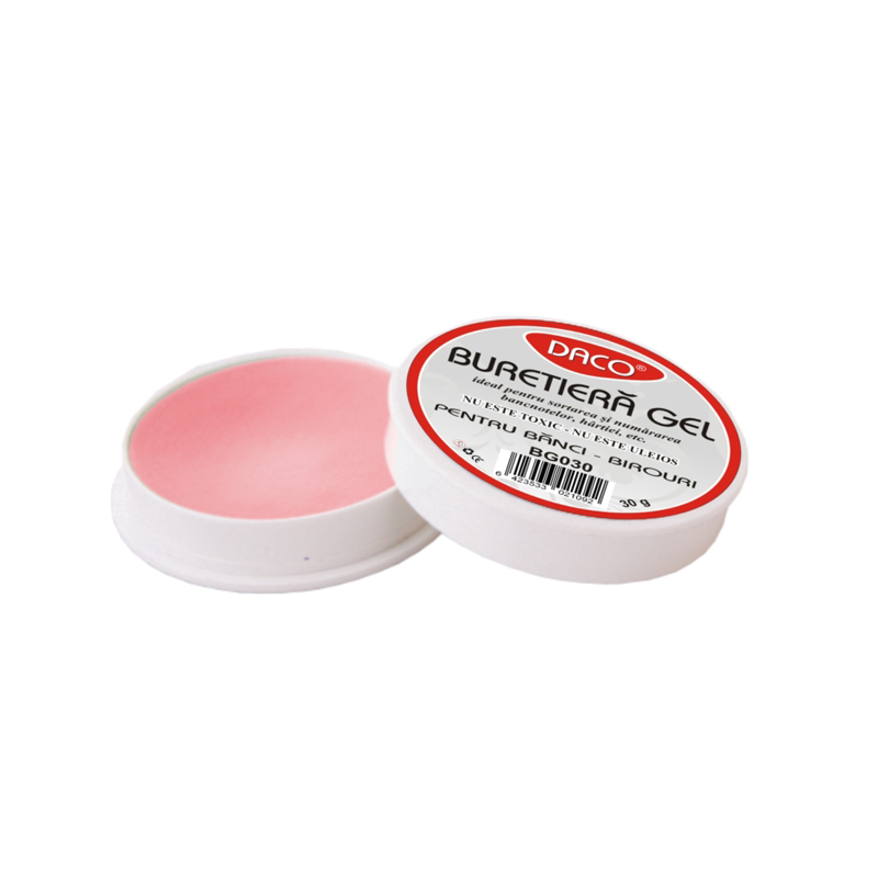 Buretiera cu gel, intr-un suport din plastic cu capac. Buretiera cu gel poate fi folosita pentru numararea banilor si a documentelor. Gelul din buretiera are un parfum placut, mentolat. Cantitate: 20 ml. Ambalare: 30 bucati/cutie.