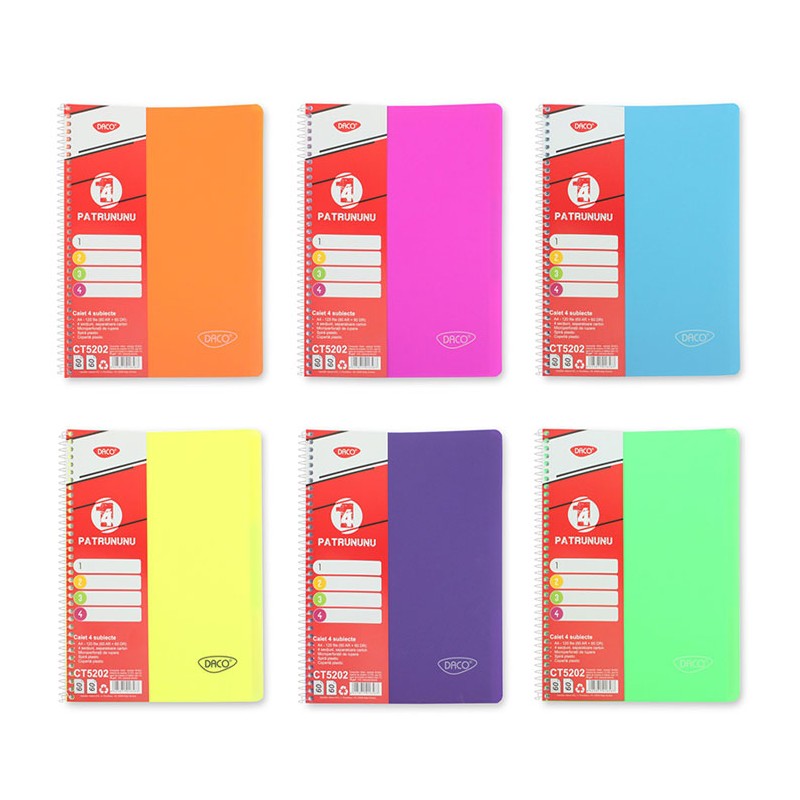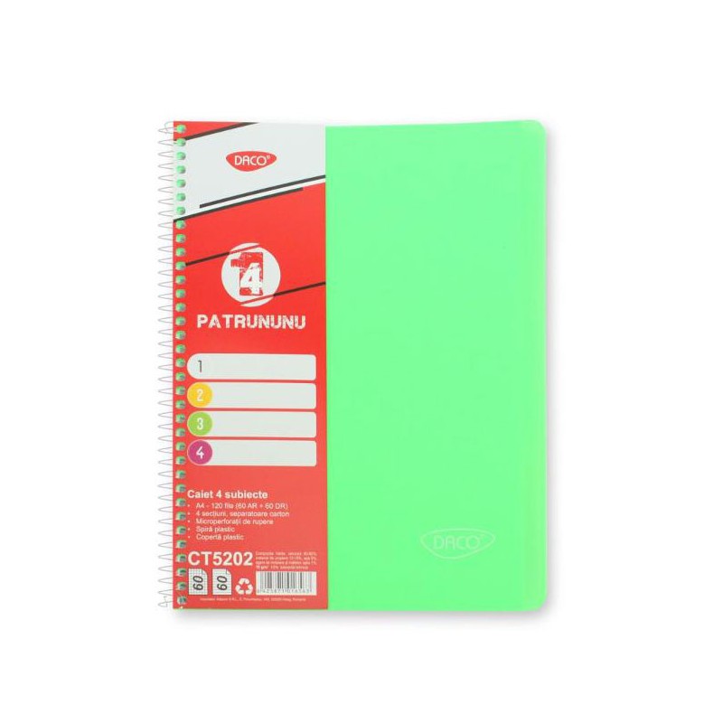 Caiet in format A4, cu un numar de 120 file (60 file liniatura tip aritmetica si 60 file liniatura tip dictando), un caiet intr-un design atragator, de foarte buna calitate. Caietul este prevazut cu sepa-ratoare din carton, care faciliteaza impartirea caietului in 4 sectiuni. Coperta caietului este realizata din polipropilena, ceea ce il face mai flexibil si rezistent, precum si usor de curatat. Hartia din inte-rior este de calitate superioara, cu un gramaj de 70 g/mp. Hartia este prevazuta cu microperforatii pentru rupere usoara si curata. Colturile caietului sunt rotunjite. Caietul este prevazut cu spire mari, realizate din plastic transparent. Caietul este realizat intr-un design modern si atragator, dar este in acelasi timp rezistent si usor de transportat.