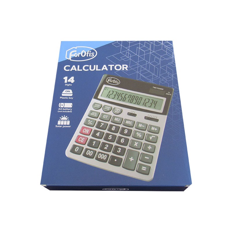 Calculator de birou cu display LCD ce afiseaza 14 digiti, cu insertii din metal. Calculatorul este dotat cu functie de Reluare automata. Acest calculator dispune de o alimentare duala: baterie A4 si celula solara. In conditii de iluminare normala, calculatorul este alimentat de celula solara. Daca iluminarea scade sub un anumit nivel, alimentarea va fi asigurata de baterie. Calculatorul este prevazut cu taste din plastic si cu picioare de cauciuc contra alunecarii. Dimensiunile calculatorului sunt urmatoarele: 186x152x27 mm.