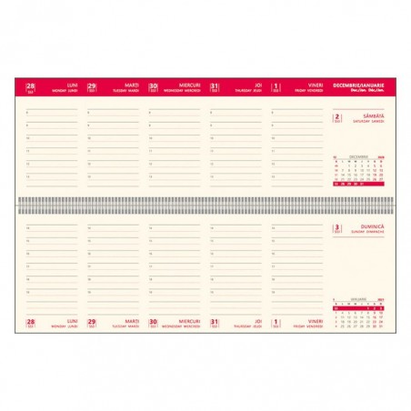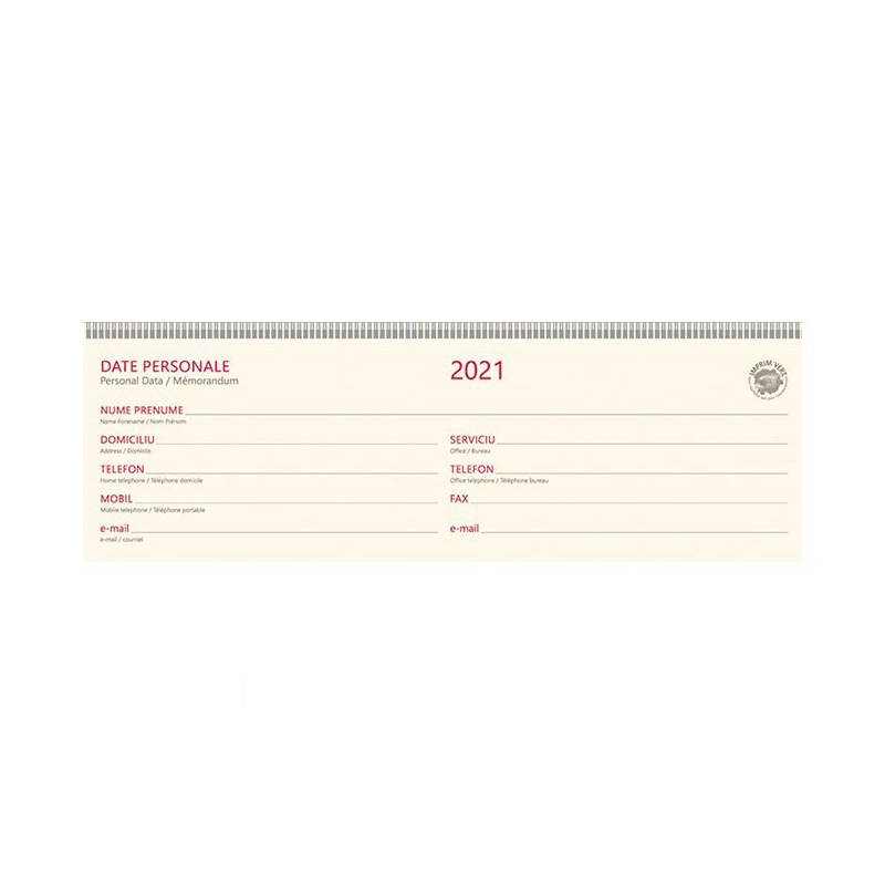 Planner datat pentru anul 2021, ce contine un numar de 112 pagini, realizate din hartie offset de culoare ivorie, cu un gramaj de 70 g/mp. Paginile plannerului sunt imprimate in doua culori: rosu si gri. Copertile planner-ului sunt cartonate, realizate din material tip imitatie de piele, de culoare verde. Plannerul este prins cu spira metalica colorata asortata cu coperta. Plannerul se preteaza pentru personalizare. Dimensiunile plannerului sunt urmatoarele: 30 x 10 cm (format finit).