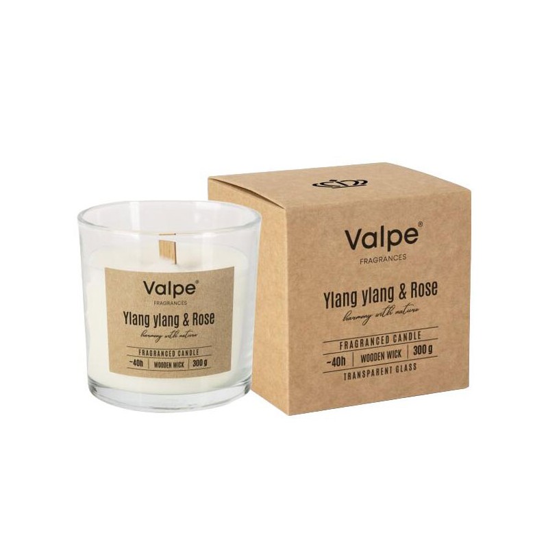 Lumanarea parfumata in pahar de sticla cu fitil de lemn, Ylang Ylang si Trandafiri, va asigura o atmosfera placuta si primitoare, datorita parfumului intens, placut aromat. Lumanarea are un design modern si placut, creat de paharul de sticla gros, transparent. Lumanarea este prevazuta cu fitil de lemn, ceea ce genereaza o nota de naturalete. Dimensiunile paharului sunt: 100x95 mm. Lumanarea se poate utiliza pentru a improspata aerul atat in locuinta personala, cat si la birou, sau poate reprezenta un cadou potrivit in orice ocazie. Timpul de ardere al lumanarii este de aproximativ 40 de ore si depinde de conditiile atmosferice si de modul de utilizare. Dupa arderea lumanarii, se poate folosi paharul de sticla pentru a crea alte decoratiuni. Se recomanda utilizarea unui suport adecvat pentru lumanare si amplasarea acesteia in locuri sigure departe de obiecte care pot lua foc. Se recomanda a nu se lasa lumanarea la indemana copiilor sau in apropierea animalelor de companie. Se recomanda a se respecta instructiunile si simbolurile de pe eticheta.