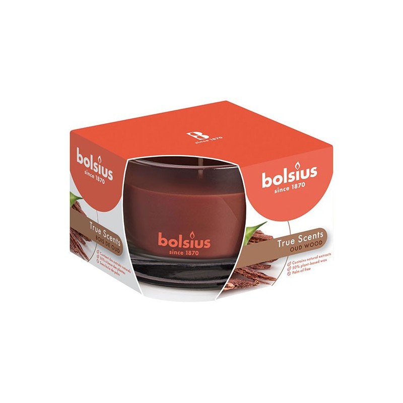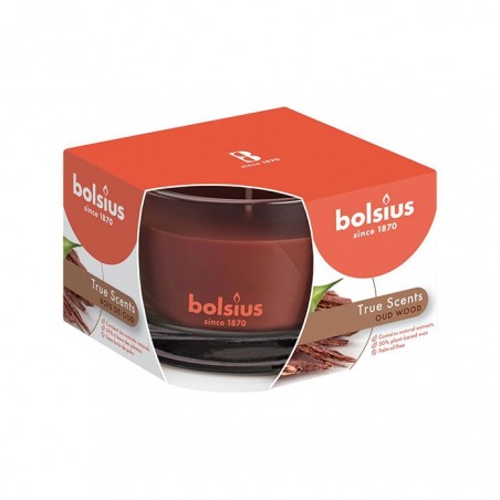 Lumanarea parfumata Bolsius Lemn de Oud, va asigura o atmosfera primitoare, datorita parfumului placut si intens. Lumanarea are un design modern, creat de paharul de sticla gros si transparent, a carui dimensiuni sunt: 80x50 mm. Lumanarea are un aspect placut, datorita culorii parafinei. Lumanarea contine extracte naturale si ceara pe baza de plante (in proportie de 50%). Lumanarea se poate utiliza pentru a improspata aerul atat in locuinta personala, cat si la birou, sau poate reprezenta un cadou potrivit in orice ocazie. Timpul de ardere al lumanarii este de aproximativ 13 ore si depinde de conditiile atmosferice si de modul de utilizare. Dupa arderea lumanarii, se poate folosi paharul de sticla pentru a crea alte decoratiuni. Se recomanda utilizarea unui suport adecvat pentru lumanare si amplasarea acesteia in locuri sigure departe de obiecte care pot lua foc. Se recomanda a nu se lasa lumanarea la indemana copiilor sau in apropierea animalelor de companie. Se recomanda a se respecta instructiunile si simbolurile de pe eticheta.