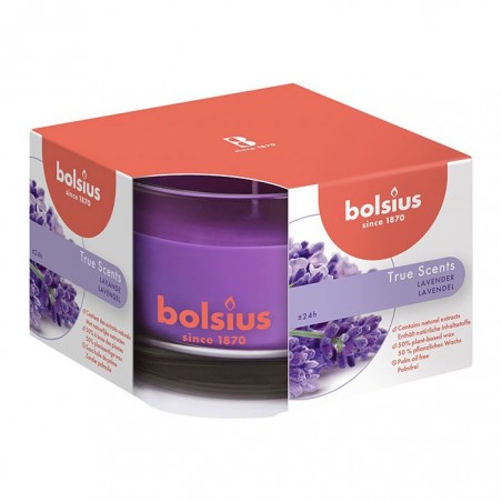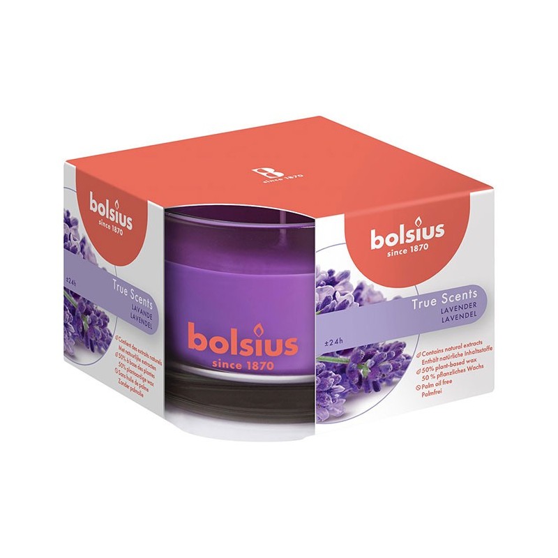 Lumanarea parfumata Bolsius Lavanda, va asigura o atmosfera primitoare, datorita parfumului placut si intens. Lumanarea are un design modern, creat de paharul de sticla gros si transparent, a carui dimensiuni sunt: 90x63 mm. Lumanarea are un aspect placut, datorita culorii parafinei. Lumanarea contine extracte naturale si ceara pe baza de plante (in proportie de 50%). Lumanarea se poate utiliza pentru a improspata aerul atat in locuinta personala, cat si la birou, sau poate reprezenta un cadou potrivit in orice ocazie. Timpul de ardere al lumanarii este de aproximativ 24 ore si depinde de conditiile atmosferice si de modul de utilizare. Dupa arderea lumanarii, se poate folosi paharul de sticla pentru a crea alte decoratiuni. Se recomanda utilizarea unui suport adecvat pentru lumanare si amplasarea acesteia in locuri sigure departe de obiecte care pot lua foc. Se recomanda a nu se lasa lumanarea la indemana copiilor sau in apropierea animalelor de companie. Se recomanda a se respecta instructiunile si simbolurile de pe eticheta.