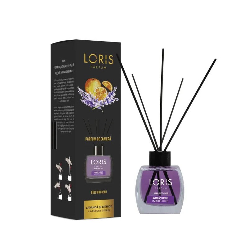 Sticluta cu odorizant lichid si betisoare Loris, va asigura o atmosfera primitoare, datorita parfumului placut, intens si relaxant, cu aroma de Lavanda si citrice. Loris a conceput o varietate de parfumuri si odorizante de camera, transformand orice spatiu intr-o atmosfera de neuitat. Amprenta sa olfactiva va fi recunoscuta si apreciata datorita uleiurilor esentiale cu arome inconfundabile ce incanta toate simturile. Betele naturale de bambus absorb si difuzeaza parfumul de lunga durata in intreaga camera, iar prin designul elegant al ambalajului il face sa devina un obiect decorativ inedit. Cutia contine o sticla cu un gramaj de 125 ml de odorizant, si 6 betisoare. Dupa deschiderea cutiei odorizantului Loris, indepartati capacul existent al flaconului si atasati-l pe cel negru prin rotire, apoi introduceti betisoarele de bambus. Intoarcerea lor la fiecare 2-3 zile asigura o mai buna difuzie a mirosului. Puteti reduce numarul de betisoare pentru a ajusta intensitatea parfumului. Se recomanda a se respecta instructiunile si simbolurile de pe eticheta. Dimensiunile sticlutei sunt urmatoare: 8.5 cm (inaltime) si 6.5 cm (latime). Dimensiunile cutiei sunt urmatoarele: 24x6.7x6.7 cm.