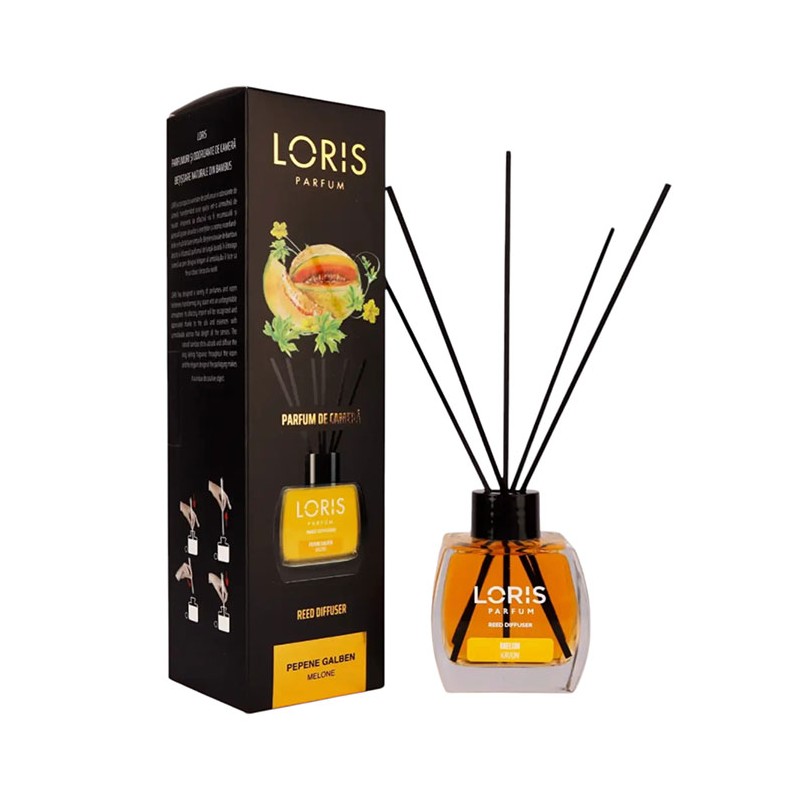 Sticluta cu odorizant lichid si betisoare Loris, va asigura o atmosfera primitoare, datorita parfumului placut, intens si relaxant, cu aroma de pepene galben. Loris a conceput o varietate de parfumuri si odorizante de camera, transformand orice spatiu intr-o atmosfera de neuitat. Amprenta sa olfactiva va fi recunoscuta si apreciata datorita uleiurilor esentiale cu arome inconfundabile ce incanta toate simturile. Betele naturale de bambus absorb si difuzeaza parfumul de lunga durata in intreaga camera, iar prin designul elegant al ambalajului il face sa devina un obiect decorativ inedit. Cutia contine o sticla cu un gramaj de 125 ml de odorizant, si 6 betisoare. Dupa deschiderea cutiei odorizantului Loris, indepartati capacul existent al flaconului si atasati-l pe cel negru prin rotire, apoi introduceti betisoarele de bambus. Intoarcerea lor la fiecare 2-3 zile asigura o mai buna difuzie a mirosului. Puteti reduce numarul de betisoare pentru a ajusta intensitatea parfumului. Se recomanda a se respecta instructiunile si simbolurile de pe eticheta. Dimensiunile sticlutei sunt urmatoare: 8.5 cm (inaltime) si 6.5 cm (latime). Dimensiunile cutiei sunt urmatoarele: 24x6.7x6.7 cm.