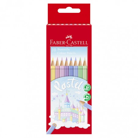 Creioane colorate Faber Castell, creioane rezistente si luminoase, de foarte buna calitate, in nuante pastel. Creioanele au corpul in forma hexagonala, clasica. Creioanele sunt proiectate dupa o tehnologie speciala de lipire a minei de corpul de lemn, pentru a preveni deteriorarea acesteia (SV). Lemnul moale permite o ascutire usoara si corecta, cu ajutorul ascutitorilor standard. Creioanele sunt vopsite cu o vopsea pe baza de apa, pentru protejarea mediului si a sanatatii copiilor. Creioanele se pot curata de pe majoritatea materialelor. Corpul creioanelor este realizat din 100% lemn din paduri certificate FSC, ceea ce atesta faptul ca produsul este fabricat din lemn din paduri certificate, administrate responsabil, din surse controlate. Creioanele colorate se livreaza ambalate in cutie de carton, 10 culori/cutie.