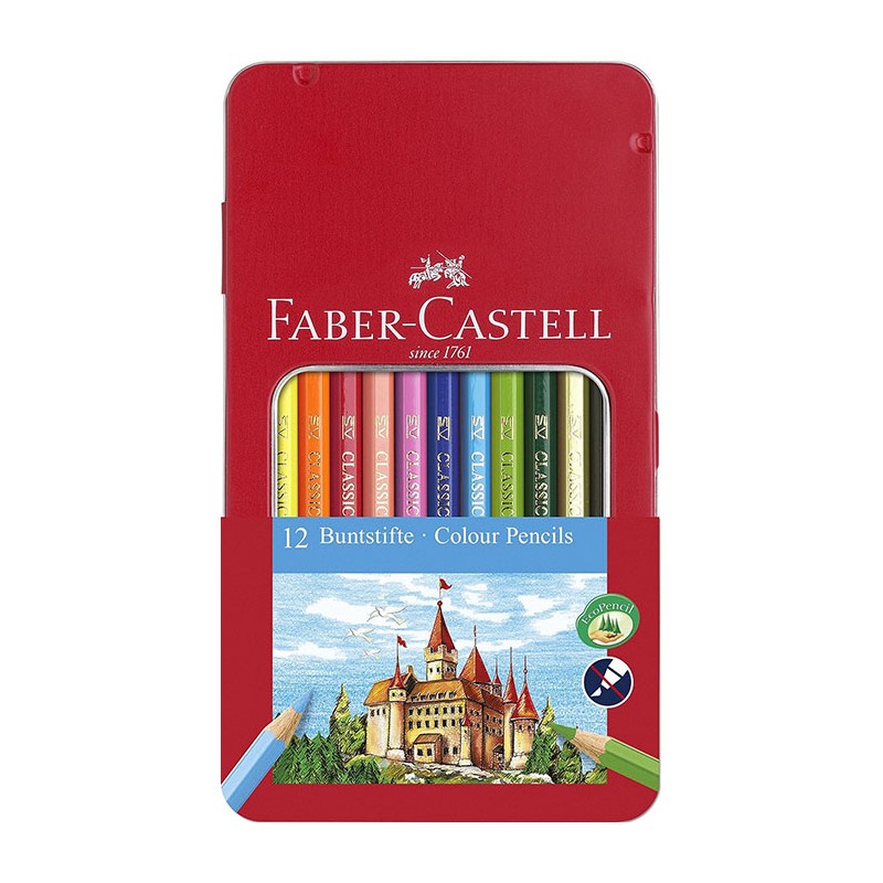 Creioane colorate Faber Castell, creioane rezistente si luminoase, de foarte buna calitate. Creioanele au corpul in forma hexagonala, clasica. Creioanele sunt proiectate dupa o tehnologie speciala de lipire a minei de corpul de lemn, pentru a preveni deteriorarea acesteia (SV). Lemnul moale permite o ascutire usoara si corecta, cu ajutorul ascutitorilor standard. Creioanele sunt vopsite cu o vopsea pe baza de apa, pentru protejarea mediului si a sanatatii copiilor. Creioanele se pot curata de pe majoritatea materialelor. Corpul creioanelor este realizat din 100% lemn din paduri certificate FSC, ceea ce atesta faptul ca produsul este fabricat din lemn din paduri certificate, administrate responsabil, din surse controlate. Creioanele colorate se livreaza ambalate in cutie de metal prevazuta cu fereastra de vizualizare continut, 12 culori/cutie.