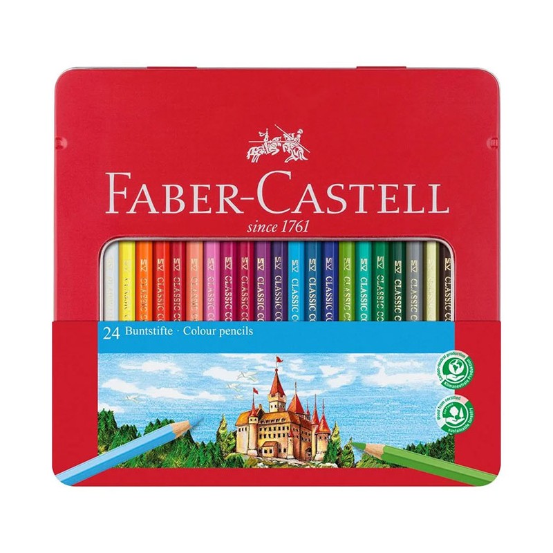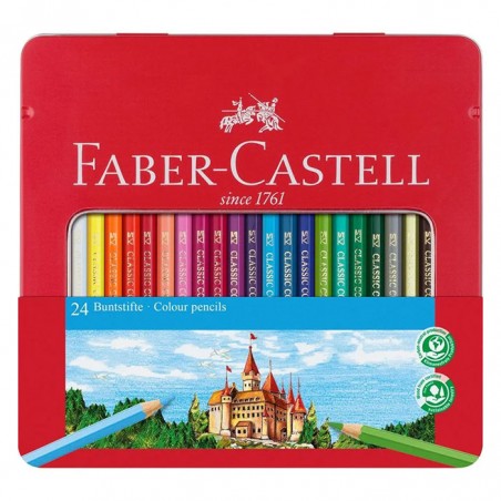 Creioane colorate Faber Castell, creioane rezistente si luminoase, de foarte buna calitate. Creioanele au corpul in forma hexagonala, clasica. Creioanele sunt proiectate dupa o tehnologie speciala de lipire a minei de corpul de lemn, pentru a preveni deteriorarea acesteia (SV). Lemnul moale permite o ascutire usoara si corecta, cu ajutorul ascutitorilor standard. Creioanele sunt vopsite cu o vopsea pe baza de apa, pentru protejarea mediului si a sanatatii copiilor. Creioanele se pot curata de pe majoritatea materialelor. Corpul creioanelor este realizat din 100% lemn din paduri certificate FSC, ceea ce atesta faptul ca produsul este fabricat din lemn din paduri certificate, administrate responsabil, din surse controlate. Creioanele colorate se livreaza ambalate in cutie de metal prevazuta cu fereastra de vizualizare continut, 24 culori/cutie.