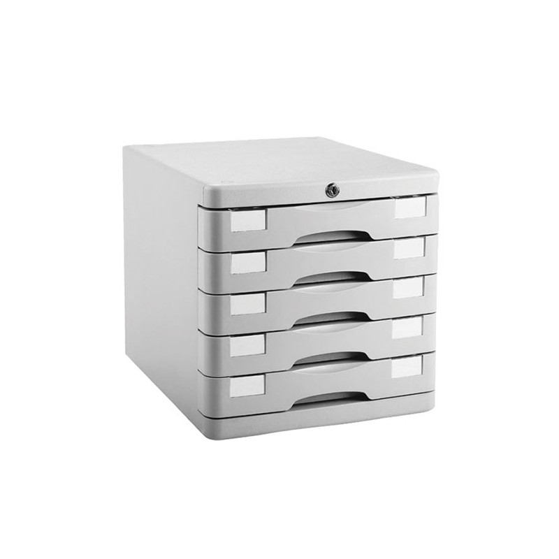 Cutie pentru organizarea usoara a documentelor, prevazuta cu 5 sertare. Cutia ajuta la clasificarea documentelor si, in plus, arata foarte bine pe orice birou. Cutia are un design modern si ergonomic, fiind realizata din plastic de calitate superioara, in culoarea gri. Sertarele functioneaza lin si silentios. Cutia este dotata cu cheie, pentru un control sporit asupra documentelor din interiorul acesteia. Dimensiunile cutiei sunt urmatoarele: 28.2x36.5x28.5 cm.