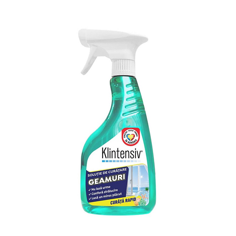 Detergentul pentru geamuri Klintensiv este solutia ideala pentru orice suprafata din sticla precum geamuri, oglinzi, ecran tv sau monitoare. Detergentul nu lasa urme, confera stralucire si lasa un miros placut. Produsul se utilizeaza ca atare. Se aplica prin pulverizare o cantitate suficienta de produs pentru a solubiliza depunerile de murdarie de pe suprafete. Curatarea se realizeaza prin tehnica stergerii suprafetelor cu o laveta textila uscata si curata. Acest produs de curatare este compatibil cu majoritatea materialelor, precum: otel inoxidabil, metale cromate, cupru, aluminiu, zinc, sticla, plastic, cauciuc, silicon, lemn natural sau acoperit. Produsul este ambalat in recipient de 500 ml, prevazut cu pulverizator.