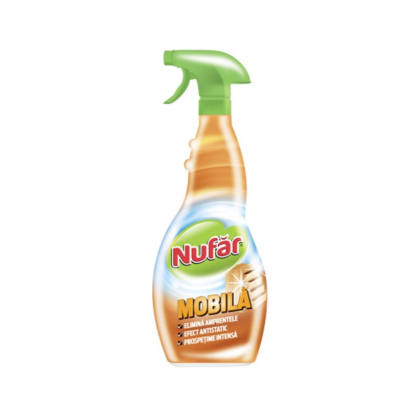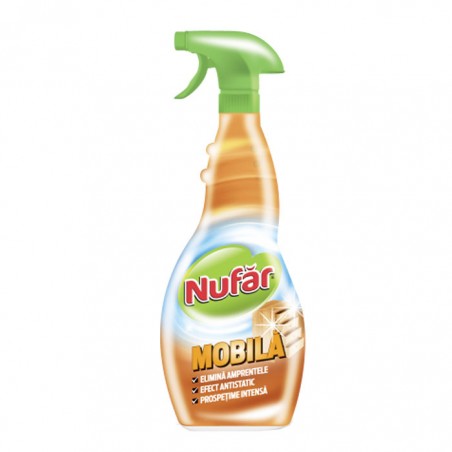Nufar Mobila este o solutie special conceputa pentru curatarea, lustruirea si protejarea articolelor de mobilier. Indeparteaza cu usurinta praful si amprentele, reinnoieste aspectul lemnului si formeaza o pelicula care impiedica depunerea prafului un timp indelungat. Solutia lasa in incapere un miros proaspat de frezii. Pulverizatorul este dotat cu element de siguranta pentru copii, oferind protectie impotriva deschiderii accidentale. Produsul este recomandat pentru: mobilier din lemn masiv, mobilier din pal melaminat, usi, rame precum si pentru alte suprafete din lemn vopsit, lacuit sau natur. Produsul este ambalat in recipient de 500 ml, prevazut cu pulverizator.