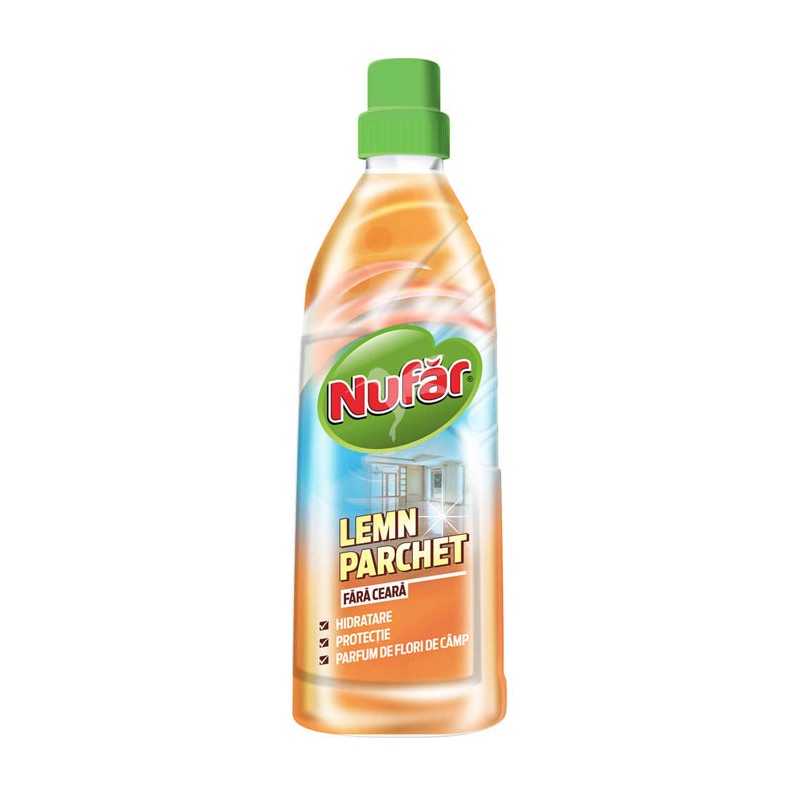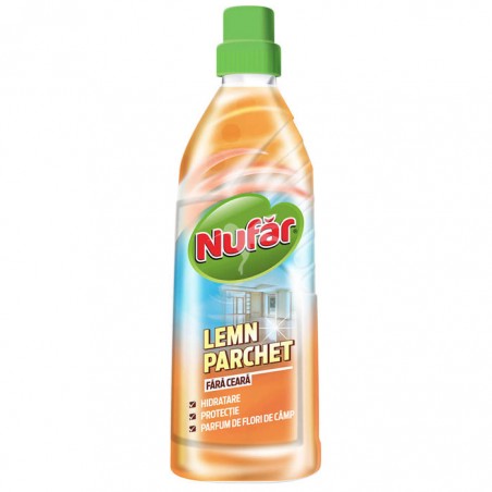 Detergentul lichid Nufar Lemn Parchet este conceput pentru curatarea tuturor suprafetelor din lemn sau laminate. Detergentul curata, indeparteaza praful si protejeaza suprafetele din lemn, fiind recomandat pentru suprafete precum: parchet laminat, parchet natur, mobilier lemn sau pal, usi, rame, alte suprafete din lemn. Nu lasa urme pe suprafete dupa utilizare si creeaza o pelicula care impiedica depunerea prafului timp indelungat. Dupa utilizare, ramane un parfum foarte proaspat in toata incaperea. Pentru suprafete mari, se dilueaza 3 capace de produs in 5 litri de apa, se sterg suprafetele cu mopul sau cu o laveta. Nu necesita clatire. Pentru suprafete mici sau greu de curatat, se foloseste produsul nediluat. Se aplica pe o laveta cateva picaturi de produs, se sterge suprafata respectiva, apoi se clateste. Produsul este ambalat in recipient de 750 ml, prevazut cu capac.