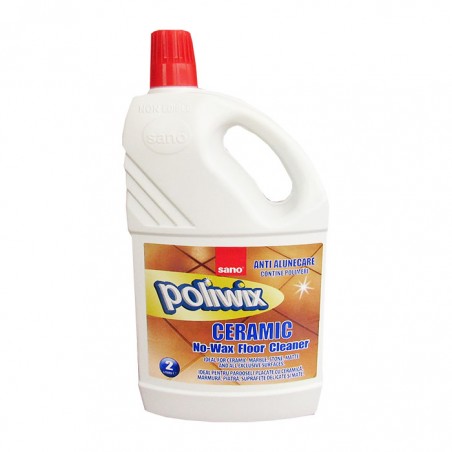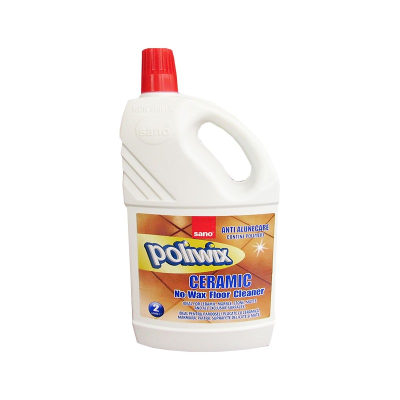 Detergentul Sano Poliwix Ceramic este ideal pentru curatarea pardoselilor placate cu ceramica, marmura, piatra, suprafete delicate si mate. Pentru o aplicare eficienta, se dilueaza doua capace de Sano Poliwix Ceramic intr-o galeata cu apa. Pentru rezultate mai bune, poate fi marita doza in apa, la 3 capacele. Cu ajutorul unei lavete, se curata suprafata, iar la final se va sterge cu o laveta curata si uscata. Produsul este ambalat in recipient de 2 litri.