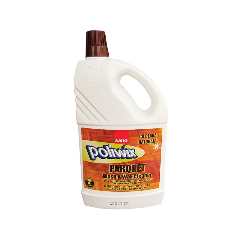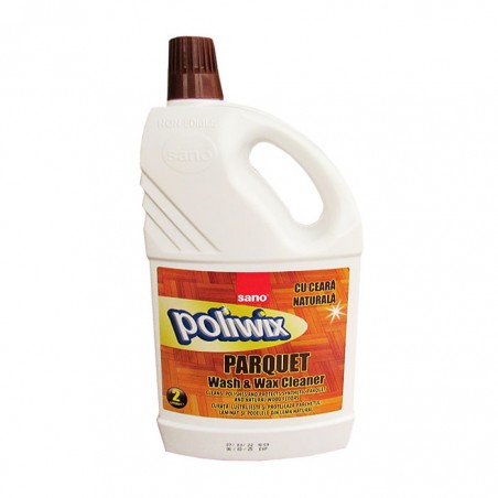 Detergentul Sano Poliwix Parquet cu ceara naturala, curata, lustruieste, protejeaza parchetul laminat, podelele din lemn natural, mobilierul si podelele din lemn natural, cat si alte suprafete delicate. Continutul de ceara naturala confera un aspect lucios lemnului si suprafetelor sintetice. Detergentul are culoarea alba, si un miros placut. Pentru o aplicare eficienta, se dilueaza doua capace de Sano Poliwix Parquet intr-o galeata cu apa. Cu ajutorul unei lavete, se curata suprafata, iar la final se va sterge cu o laveta curata si uscata. Produsul nu necesita clatire. Produsul este ambalat in recipient de 2 litri.