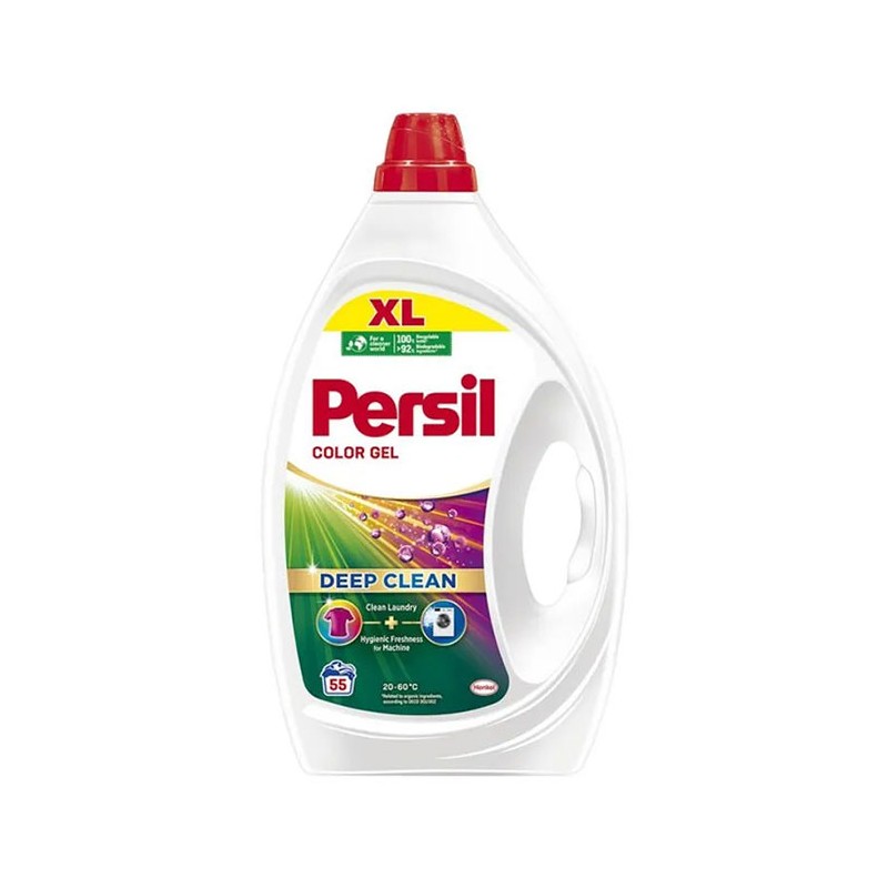 Detergentul lichid Persil Color Gel ofera o indepartare exceptionala a petelor de la prima spalare. Detergentul lichid pentru rufe colorate curata eficient si ofera stralucire hainelor. Are la baza o tehnologie ce patrunde adanc in tesatura, eliminand chiar si cele mai dificile pete. Noua formula imbunatatita actioneaza si in interiorul masinii de spalat, combatand mirosurile neplacute. Asigura rezultate excelente, lasand haine curate si cu un parfum deosebit, de lunga durata. De asemenea, previne decolorarea rufelor si este foarte delicat cu tesaturile. Produsul este ambalat in sticla de 2.475 litri, pentru aproximativ 55 spalari.