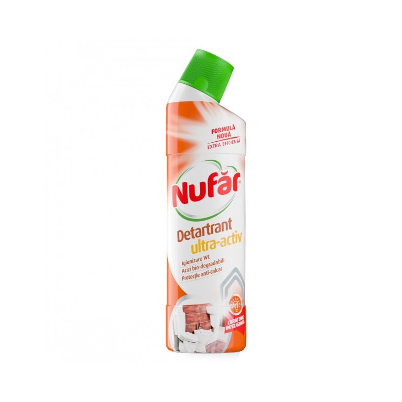 Detartrantul Nufar Ultra-Activ curata si indeparteaza fara efort depunerile de calcar si petele de rugina sau mizerie din interiorul vasului de toaleta si de pe alte obiecte sanitare din faianta, prin continutul de acizi organici biodegradabili. Detartrantul elimina, totodata, mirosurile neplacute (contine parfum de lamaie), lasand vasul de toaleta stralucitor de curat si parfumat. Utilizarea zilnica a produsului previne formarea depunerilor de piatra. Turnati solutia direct sub marginea vasului de toaleta si lasati sa actioneze 10-15 minute. Periati si clatiti foarte bine cu apa. Pentru depunerile persistente de calcar, lasati produsul sa actioneze mai mult timp sau repetati operatia. Produsul este ambalat in recipient de 750 ml.