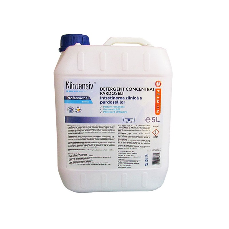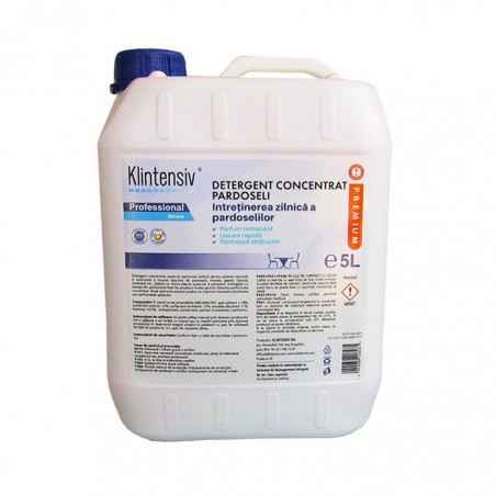 Detergentul pentru pardoseli, intretinere zilnica, Klintensiv este un detergent concentrat, puternic parfumat, indicat pentru spalarea manuala si automata a tutror tipurilor de pardoseli, mosaic, gresie, faianta sau ceramica, lasand un miros placut, puternic si persistent. Detergentul este imbogatit cu esente din parfumerie fina. Nu produce multa spuma. Datorita parfumului concetrat, dupa aplicarea acestui produs, nu mai este necesara odorizarea sau parfumarea spatiului. Fiind ambalat in recipient economic de 5 litri, detergentul este ideal pentru institutii, hoteluri, restaurante, mall-uri si alte spatii sanitare.