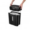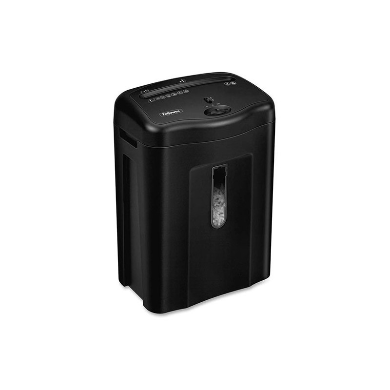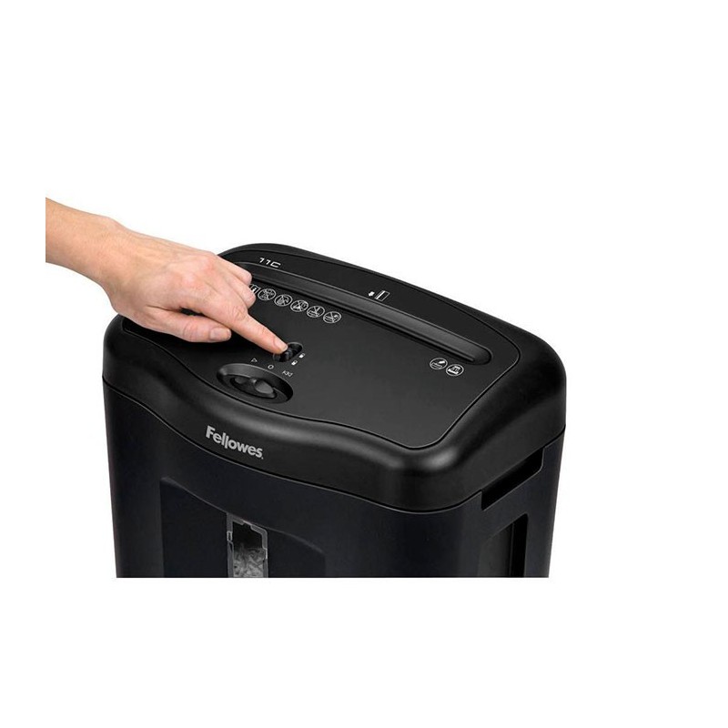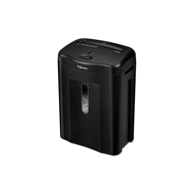 Distrugator de documente Fellowes Powershred 11C, un echipament eficient, cu deschidere de 230 mm, pentru utilizare ocazionala intr-un birou mic sau acasa, fiind usor de folosit. Distrugatorul de documente realizeaza o taiere tip confetti (cross-cut), care asigura un nivel de securitate DIN P-3, potrivit pentru documente confidentiale, fiind dificil de asamblat si citit. Dimensiunea particulei: 4x52 mm. Numar de particule pe o coala A4: aproximativ 300. Capacitatea de taiere este de 11 coli cu o grosime de 70 g/mp. Distruge atat hartie, cat si carduri, capse sau agrafe de hartie. Functia Safety Lock dezactiveaza manual aparatul, prevenind pornirea neintentionata a acestuia si accidentarea. Distrugatorul dispune de un cos de deseuri cu fereastra, pentru vizualizarea nivelului de incarcare cu particule de hartie, de o capacitate de 18 litri. Echipamentul este prevazut cu functia Auto/Start/Oprire. Timpul de functionare continua: 5 min - pornit / 30 min - oprit. Dimensiunile exterioare ale distrugatorului de documente sunt urmatoarele: 429x346x238 mm.