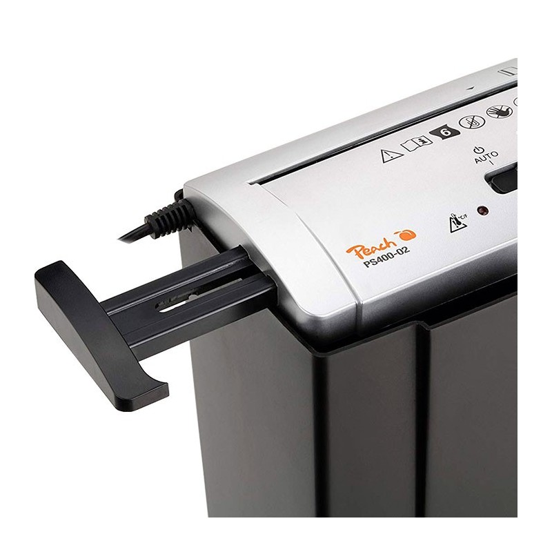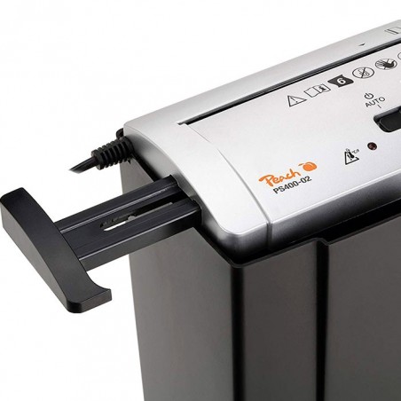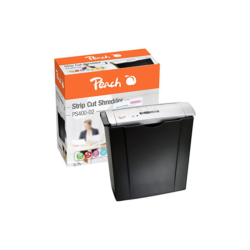 Distrugator de documente Peach PS400-02, un echipament eficient, cu deschidere de 220 mm, recomandat pentru utilizare moderata acasa sau la birou. Distrugatorul de documente realizeaza o taiere tip fasii (strip-cut), care asigura un nivel de securitate DIN P-1, potrivit pentru documente mai putin sensibile. Latimea fasiei: 7 mm. Numar de fasii pe o coala A4: aproximativ 30. Capacitatea de taiere este de 7 coli cu o grosime de 70 g/mp, sau 6 coli cu o grosime de 80 g/mp, cu o viteza de 3.3 m/min. Distruge atat hartie, cat si carduri. Aparatul este dotat cu sistem de protectie impotriva supraincalzirii si cu functie reverse pentru o eliminare usoara a blocajelor. Peach PS400-02 dispune de un cos de deseuri de o capacitate de 8 litri, echivalent a 50 de coli distruse. Timpul de functionare: 2 minute - pornit / 30 minute - oprit. Dimensiunile exterioare ale distrugatorului de documente sunt urmatoarele: 295x275x140 mm.