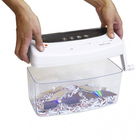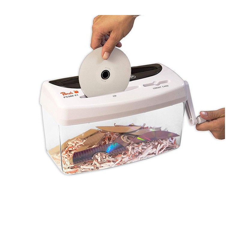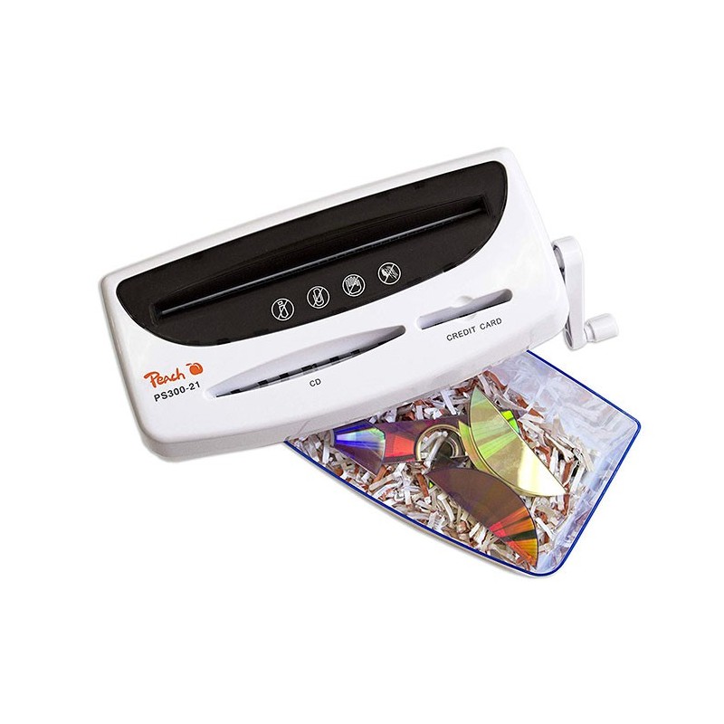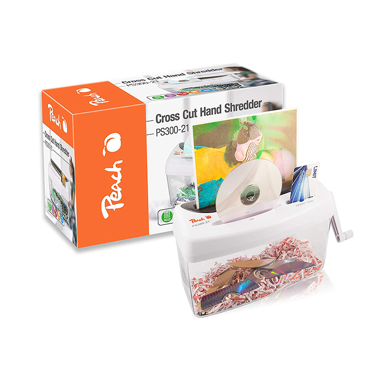 Distrugator manual de documente Peach PS300-21, un echipament eficient, cu deschidere de 216 mm, recomandat pentru utilizare in activitati acasa, pentru un volum mic de lucru. Acest aparat este mereu gata de a fi utilizat, nefiind nevoie sa il conectati la reteaua electrica: functioneaza prin actionarea manuala a manetei. Distrugatorul de documente realizeaza o taiere tip confetii (cross-cut), care asigura un nivel de securitate DIN P-4, potrivit pentru documente confidentiale, fiind greu de asamblat si citit. Dimensiunea particulei: 3.5x40 mm. Numar de particule pe o coala A4: aproximativ 442. Capacitatea de taiere este de o coala cu o grosime de 80 g/mp. Distruge atat hartie, cat si carduri sau CD-uri si DVD-uri. Peach PS300-21 dispune de un cos de deseuri transparent de o capacitate de 4 litri. Dimensiunile exterioare ale distrugatorului de documente sunt urmatoarele: 314x188x150 mm.