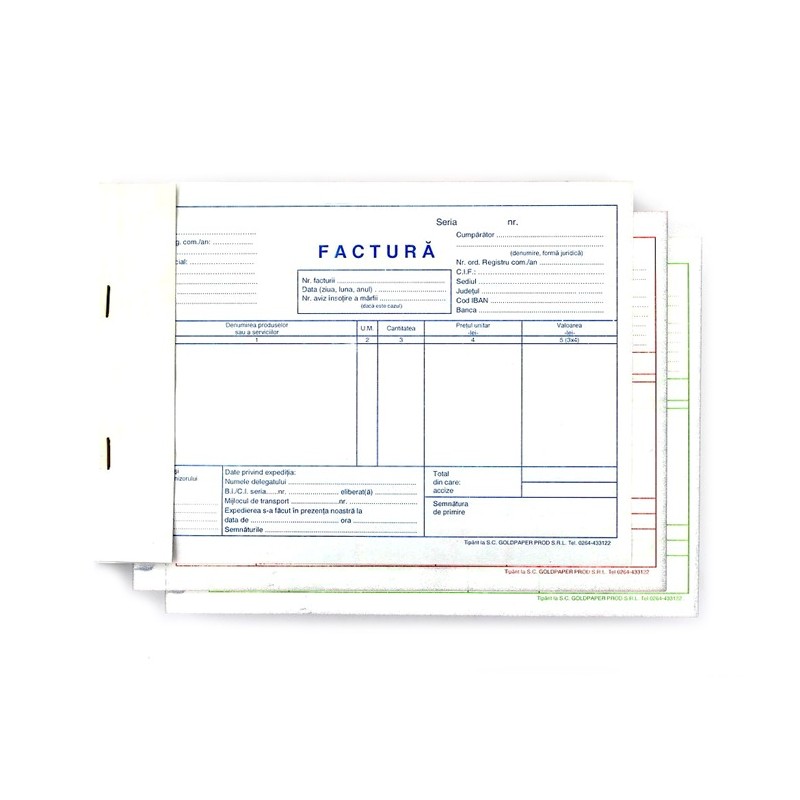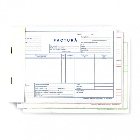 Factura autocopiativa fara TVA este un formular tipizat, ce are formatul A5 cu orientare vedere. Blocul de facturi contine un numar de 150 file, impartite in 50 seturi a cate 3 exemplare, neinseriate. Formularul este tiparit doar fata, color (albastru, rosu si verde/set), pe hartie autocopiativa de 55g/mp. Blocul de facturi are coperta din carton duplex alb, este capsat si are perforatii pentru o detasare mai usoara a fiecarui exemplar.