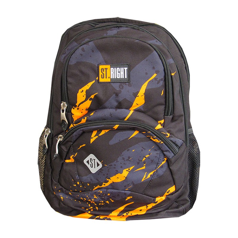 Ghiozdan Majewski Gama St. Right, Colectia Lava, un ghiozdan modern si confortabil, de foarte buna calitate, finisat si decorat cu tehnologii avansate. Ghiozdanul este confectionat din materiale impermeabile, rezistente la uzura si inghet. Ghiozdanul este deosebit de incapator, cu o compartimentare excelenta, avand spatii pentru carti, caiete, accesorii si rechizite, asigurand astfel o foarte buna organizare. Prevazut cu doua compartimente principale ce se inchid cu doua fermoare si trei compartimente frontale ce se inchid cu fermoar, ghiozdanul este deosebit de spatios si practic. Compartimentul principal al ghiozdanului este dotat cu un buzunar special captusit cu fleece pentru a pastra telefonul sau castile, un spatiu pentru personalizare (destinat pentru a nota numele, numarul de telefon si adresa de e-mail) si o iesire pentru casti. Unul din compartimentele frontale ale ghiozdanului este dotat cu mai multe separatoare interioare (destinate articolelor precum chei, bani, memory-stick-uri, accesorii telefon, instrumente de scris sau alte obiecte importante de mici dimensiuni), precum si cu un breloc detasabil pentru cheie. Celalalt compartiment frontal este dotat cu un buzunar pentru accesoriile telefonului, laptopului sau tabletei, precum alimentatoare, cabluri, mouse sau altele. Ghiozdanul este prevazut cu doua buzunare laterale cu elastic, ideale pentru a pastra recipientul cu apa. Ghiozdanul este prevazut cu un maner buretat pentru a putea fi purtat si in mana. Spatele si bretelele sunt intarite si buretate cu un burete gros, oferindu-le fermitate si avand rolul de a proteja umerii si spatele. Spatele ghiozdanului este buretat ergonomic, dotat cu o zona de contact cu plasa, pentru o buna circulatie a aerului. Bretelele ghiozdanului sunt ajustabile, pentru ca acesta sa poata fi aranjat perfect pe spate. Ghiozdanul este prevazut cu elemente reflectorizante pe partea din fata. Fermoarele au zona de prindere plastifiata si profilata, pentru prindere usoara. Cheitele fermoarului compartimentului principal permit utilizarea unui lacat sau a unei criptari TSA. Dimensiunile ghiozdanului sunt urmatoarele: 42x30x17 cm.