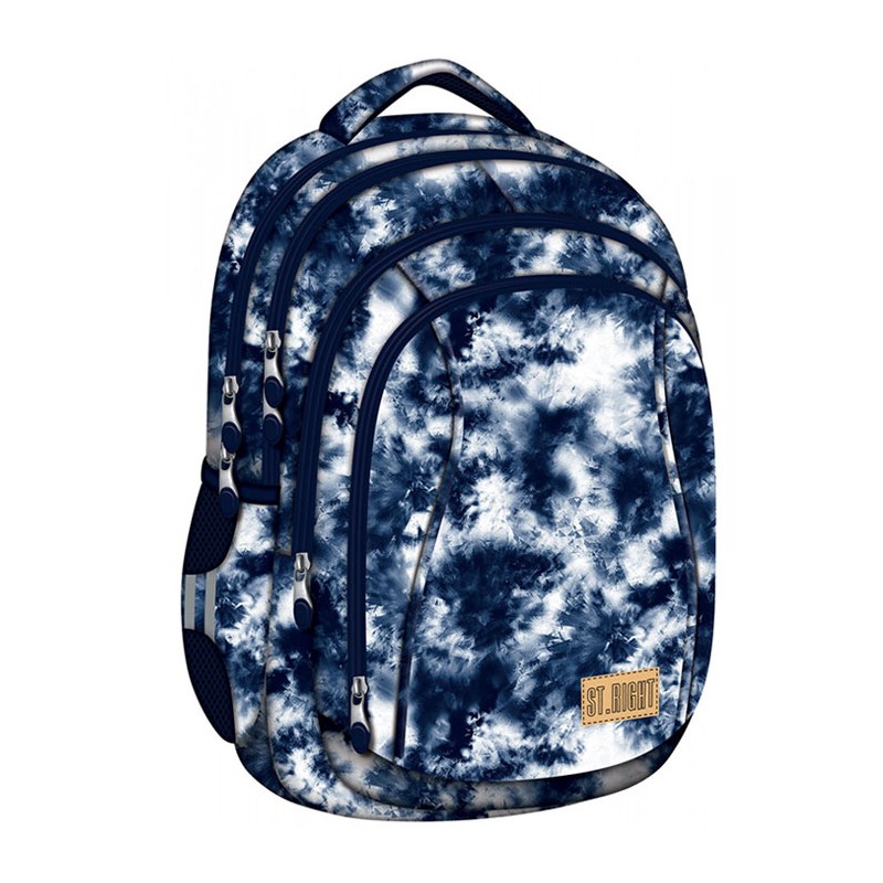 Ghiozdan prevazut cu 4 compartimente, Majewski, Gama St. Right, Colectia Stormy Sky, un ghiozdan modern si confortabil, de foarte buna calitate, finisat si decorat cu tehnologii avansate. Ghiozdanul este confectionat din materiale impermeabile, rezistente la uzura si inghet. Ghiozdanul este deosebit de incapator, cu o compartimentare excelenta, avand spatii pentru carti, caiete, accesorii si rechizite, asigurand astfel o foarte buna organizare. Prevazut cu un compartiment principal ce se inchide cu doua fermoare si trei compartimente frontale ce se inchid cu fermoar, ghiozdanul este deosebit de incapator si practic. Unul din compartimentele frontale se inchide cu 2 fermoare. Compartimentul principal al ghiozdanului este dotat cu un buzunar special captusit cu fleece pentru a pastra telefonul sau castile, un spatiu pentru personalizare (destinat pentru a nota numele, numarul de telefon si adresa de e-mail) si o iesire pentru casti. Unul din compartimentele frontale este dotat cu un buzunar pentru accesoriile telefonului, laptopului sau tabletei, precum alimentatoare, cabluri, mouse sau altele. Celalalt compartiment frontal este dotat cu mai multe separatoare interioare (destinate articolelor precum chei, bani, memory-stick-uri, accesorii telefon, instrumente de scris sau alte obiecte importante de mici dimensiuni), precum si cu un breloc detasabil pentru cheie. Ghiozdanul are doua buzunare laterale, ideale pentru a pastra recipientul cu apa. Ghiozdanul este dotat cu elemente reflectorizante pe laterale si pe bretele. Ghiozdanul este prevazut cu un maner buretat pentru a putea fi purtat si in mana. Spatele si bretelele sunt intarite si buretate cu un burete gros, oferindu-le fermitate si avand rolul de a proteja umerii si spatele. Spatele ghiozdanului este buretat ergonomic, dotat cu o zona de contact cu plasa, pentru o buna circulatie a aerului. Bretelele ghiozdanului sunt ajustabile, pentru ca acesta sa poata fi aranjat perfect pe spate. Fermoarele au zona de prindere cauciucata si profilata, pentru prindere usoara. Cheitele fermoarului compartimentului principal permit utilizarea unui lacat sau a unei criptari TSA. Baza ghiozdanului are zone de contact cauciucate pentru protejare la umezeala. Dimensiunile ghiozdanului sunt urmatoarele: 43x32x16 cm.
