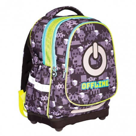 Ghiozdan Yollo Offline, un ghiozdan confectionat dintr-un material rezistent. Prevazut cu un compartiment principal ce se inchide cu doua fermoare si doua compartimente frontale ce se inchid tot cu fermoar, ghiozdanul este deosebit de incapator si practic. Ghiozdanul este prevazut cu maner in partea superioara pentru a putea fi purtat si in mana. Spatele si bretelele sunt intarite si buretate cu un burete gros, oferindu-le fermitate si avand rolul de a proteja umerii si spatele. Spatele ghiozdanului este buretat ergonomic, dotat cu o zona de contact cu plasa, pentru o buna circulatie a aerului. Bretelele ghiozdanului sunt ajustabile, pentru ca acesta sa poata fi aranjat perfect pe spate. Ghiozdanul este prevazut cu cusaturi triple, pentru o mai mare rezistenta in timp. Fermoarele au zona de prindere cauciucata si profilata, pentru prindere usoara. Baza ghiozdanului este tare, realizata din spuma EVA, si prevazuta cu patru picioruse pentru a preveni contactul direct cu pardoseala, expunerea la apa sau murdarie. Dimensiunile ghiozdanului sunt urmatoarele: 38x39x19.5 cm.