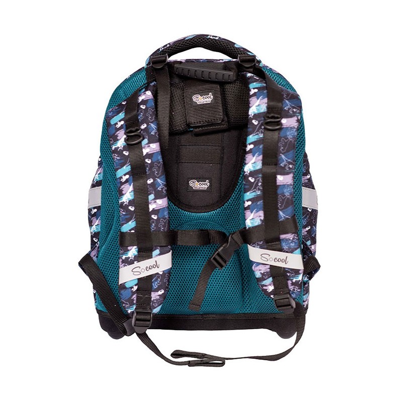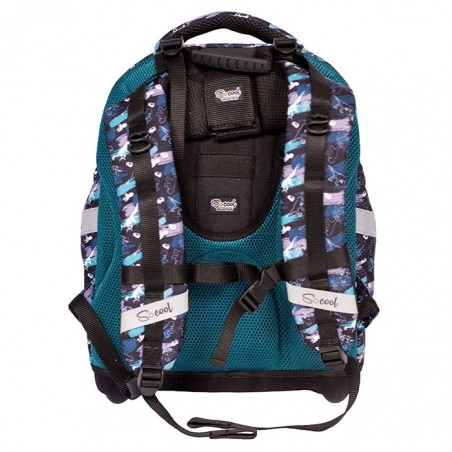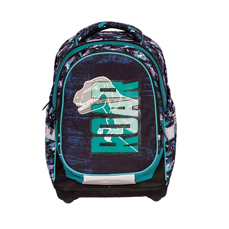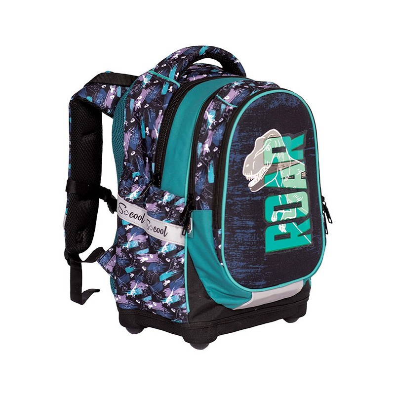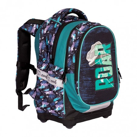 Ghiozdan pentru clasele V-VIII, S-cool Dino, un ghiozdan modern si confortabil, de foarte buna calitate. Ghiozdanul este confectionat din materiale impermeabile, rezistente la uzura. Ghiozdanul este deosebit de incapator, cu o compartimentare excelenta, avand spatii pentru carti, caiete, accesorii si rechizite, asigurand astfel o foarte buna organizare. Prevazut cu un compartiment principal ce se inchide cu fermoar si un compartiment frontal ce se inchide tot cu fermoar, ghiozdanul este deosebit de spatios si practic. Ghiozdanul este prevazut cu un compartiment special pentru pastrarea si transportul laptopului. Ghiozdanul este prevazut cu doua buzunare laterale cu elastic, ideale pentru a pastra recipientul cu apa. Ghiozdanul este prevazut cu un maner buretat pentru a putea fi purtat si in mana. Spatele si bretelele sunt intarite si buretate cu un burete gros, oferindu-le fermitate si avand rolul de a proteja umerii si spatele. Spatele ghiozdanului este buretat ergonomic, dotat cu o zona de contact cu plasa, pentru o buna circulatie a aerului. Bretelele ghiozdanului sunt ajustabile, pentru ca acesta sa poata fi aranjat perfect pe spate. Ghiozdanul este prevazut cu cusaturi triple, pentru o mai mare rezistenta in timp. Fermoarele au zona de prindere cauciucata si profilata, pentru prindere usoara. Baza ghiozdanului este tare, realizata din spuma EVA, si prevazuta cu patru picioruse pentru a preveni contactul direct cu pardoseala, expunerea la apa sau murdarie. Dimensiunile ghiozdanului sunt urmatoarele: 43x34x22 cm.