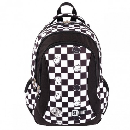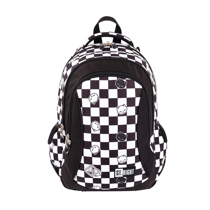 Ghiozdan pentru clasele I-IV, 3 compartimente, Majewski, Gama St. Right, Colectia Chess Cats, un ghiozdan modern si confortabil, de foarte buna calitate, finisat si decorat cu tehnologii avansate. Ghiozdanul este confectionat din materiale impermeabile, rezistente la uzura si inghet. Ghiozdanul este deosebit de incapator, cu o compartimentare excelenta, avand spatii pentru carti, caiete, accesorii si rechizite, asigurand astfel o foarte buna organizare. Prevazut cu un compartiment principal ce se inchide cu doua fermoare si doua compartimente frontale ce se inchid cu fermoar, ghiozdanul este deosebit de spatios si practic. Compartimentul principal al ghiozdanului este dotat cu un buzunar special pentru a pastra diverse articole de mici dimensiuni. Unul din compartimentele frontale ale ghiozdanului este dotat cu mai multe separatoare interioare (destinate articolelor precum chei, bani, memory-stick-uri, accesorii telefon, instrumente de scris sau alte obiecte importante de mici dimensiuni), precum si cu un breloc detasabil pentru cheie. Ghiozdanul este prevazut cu doua buzunare laterale cu elastic, ideale pentru a pastra recipientul cu apa. Ghiozdanul este dotat cu elemente reflectorizante pe partea din fata, pe bretele si pe laterale. Ghiozdanul este prevazut cu un maner buretat pentru a putea fi purtat si in mana. Spatele si bretelele sunt intarite si buretate cu un burete gros, oferindu-le fermitate si avand rolul de a proteja umerii si spatele. Spatele ghiozdanului este buretat ergonomic, dotat cu o zona de contact cu plasa, pentru o buna circulatie a aerului. Bretelele ghiozdanului sunt ajustabile, pentru ca acesta sa poata fi aranjat perfect pe spate. Fermoarele au zona de prindere cauciucata si profilata, pentru prindere usoara. Cheitele fermoarului compartimentului principal permit utilizarea unui lacat sau a unei criptari TSA. Baza ghiozdanului are zone de contact cauciucate pentru protejare la umezeala. Dimensiunile ghiozdanului sunt urmatoarele: 40x26x13 cm.