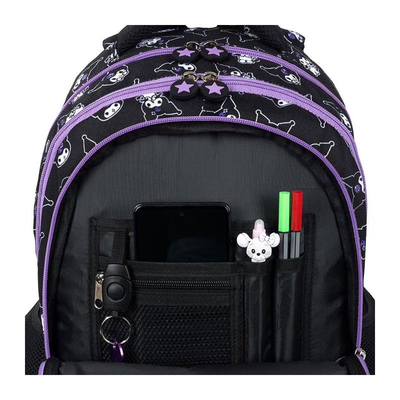 Ghiozdan pentru clasele I-IV, 4 compartimente, Majewski, Colectia Kuromi Black, un ghiozdan modern si confortabil, de foarte buna calitate, finisat si decorat cu tehnologii avansate. Ghiozdanul este confectionat din materiale impermeabile, rezistente la uzura si inghet. Ghiozdanul este deosebit de incapator, cu o compartimentare excelenta, avand spatii pentru carti, caiete, accesorii si rechizite, asigurand astfel o foarte buna organizare. Prevazut cu un compartiment principal ce se inchide cu doua fermoare si trei compartimente frontale ce se inchid cu fermoar, ghiozdanul este deosebit de spatios si practic. Compartimentul principal este prevazut cu buzunar interior, pentru pastrarea si transportul tabletei. Unul din compartimentele frontale este dotat cu mai multe separatoare interi-oare (destinate articolelor precum chei, bani, memory-stick-uri, accesorii telefon, instrumente de scris sau alte obiecte importante de mici dimensiuni), precum si cu un breloc detasabil pentru cheie. Ghiozdanul este prevazut cu doua buzunare laterale cu plasa, ideale pentru a pastra recipientul cu apa. Ghiozdanul este dotat cu elemente reflectorizante pe partea din fata, pe laterale si pe bretele. Ghiozdanul este prevazut cu un maner buretat pentru a putea fi purtat si in mana. Spatele si bretelele sunt intarite si buretate cu un burete gros, oferindu-le fermitate si avand rolul de a proteja umerii si spatele. Spatele ghiozdanului este buretat ergonomic, dotat cu o zona de contact cu plasa, pentru o buna circulatie a aerului. Bretelele ghiozdanului sunt ajustabile, pentru ca acesta sa poata fi aranjat perfect pe spate. Fermoarele au zona de prindere cauciucata si profilata, pentru prindere usoara. Ba-za ghiozdanului are zone de contact cauciucate pentru protejare la umezeala. Dimensiunile ghi-ozdanului sunt urmatoarele: 40x28x18 cm.