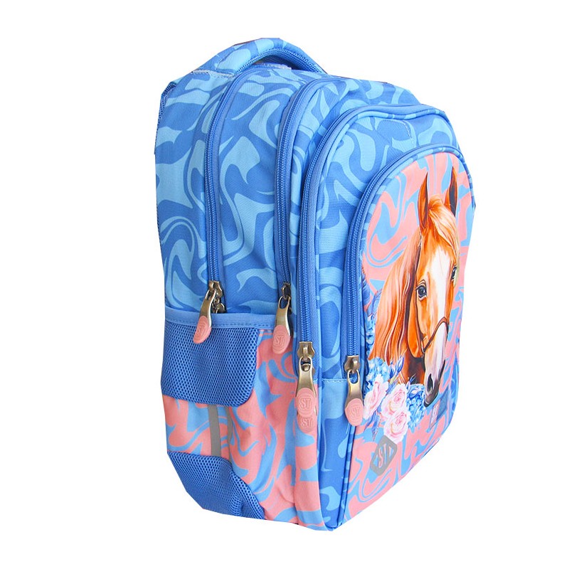 Ghiozdan pentru clasele I-IV, 4 compartimente, Majewski, Gama St. Right, Colectia Romantic Horse, un ghiozdan modern si confortabil, de foarte buna calitate, finisat si decorat cu tehnologii avansate. Ghiozdanul este confectionat din materiale impermeabile, rezistente la uzura si inghet. Ghiozdanul este deosebit de incapator, cu o compartimentare excelenta, avand spatii pentru carti, caiete, accesorii si rechizite, asigurand astfel o foarte buna organizare. Prevazut cu un compartiment principal ce se inchide cu doua fermoare si trei compartimente frontale ce se inchid cu fermoar, ghiozdanul este deosebit de spatios si practic. Doua din cele trei compartimente frontale sunt prevazute cu cate 2 fermoare. Compartimentul principal al ghiozdanului este dotat cu un buzunar special captusit cu fleece pentru a pastra telefonul sau castile, un spatiu pentru personalizare (destinat pentru a nota numele, numarul de telefon si adresa de e-mail) si o iesire pentru casti. Unul din compartimentele frontale este dotat cu mai multe separatoare interioare (destinate articolelor precum chei, bani, memory-stick-uri, accesorii telefon, instrumente de scris sau alte obiecte importante de mici dimensiuni), precum si cu un breloc detasabil pentru cheie. Ghiozdanul este prevazut cu doua buzunare laterale cu plasa, ideale pentru a pastra recipientul cu apa. Ghiozdanul este dotat cu elemente reflectorizante pe partea din fata, pe laterale si pe bretele. Ghiozdanul este prevazut cu un maner buretat pentru a putea fi purtat si in mana. Spatele si bretelele sunt intarite si buretate cu un burete gros, oferindu-le fermitate si avand rolul de a proteja umerii si spatele. Spatele ghiozdanului este buretat ergonomic, dotat cu o zona de contact cu plasa, pentru o buna circulatie a aerului. Bretelele ghiozdanului sunt ajustabile, pentru ca acesta sa poata fi aranjat perfect pe spate. Fermoarele au zona de prindere cauciucata si profilata, pentru prindere usoara. Cheitele fermoarului compartimentului principal permit utilizarea unui lacat sau a unei criptari TSA. Baza ghiozdanului are zone de contact cauciucate pentru protejare la umezeala. Dimensiunile ghiozdanului sunt urmatoarele: 40x28x18 cm.