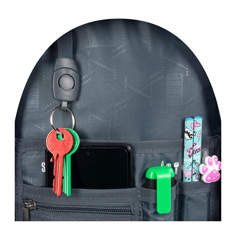 Ghiozdan pentru clasele I-IV, 3 compartimente, Majewski, Gama St. Right, Colectia Colour Pads, un ghiozdan modern si confortabil, de foarte buna calitate, finisat si decorat cu tehnologii avansate. Ghiozdanul este confectionat din materiale impermeabile, rezistente la uzura si inghet. Ghiozdanul este deosebit de incapator, cu o compartimentare excelenta, avand spatii pentru carti, caiete, accesorii si rechizite, asigurand astfel o foarte buna organizare. Prevazut cu un compartiment principal ce se inchide cu doua fermoare si doua compartimente frontale ce se inchid cu fermoar, ghiozdanul este deosebit de spatios si practic. Compartimentul principal al ghiozdanului este dotat cu un buzunar special pentru a pastra diverse articole de mici dimensiuni. Unul din compartimentele frontale ale ghiozdanului este dotat cu mai multe separatoare interioare (destinate articolelor precum chei, bani, memory-stick-uri, accesorii telefon, instrumente de scris sau alte obiecte importante de mici dimensiuni), precum si cu un breloc detasabil pentru cheie. Ghiozdanul este prevazut cu doua buzunare laterale cu elastic, ideale pentru a pastra recipientul cu apa. Ghiozdanul este dotat cu elemente reflectorizante pe partea din fata, pe bretele si pe laterale. Ghiozdanul este prevazut cu un maner buretat pentru a putea fi purtat si in mana. Spatele si bretelele sunt intarite si buretate cu un burete gros, oferindu-le fermitate si avand rolul de a proteja umerii si spatele. Spatele ghiozdanului este buretat ergonomic, dotat cu o zona de contact cu plasa, pentru o buna circulatie a aerului. Bretelele ghiozdanului sunt ajustabile, pentru ca acesta sa poata fi aranjat perfect pe spate. Fermoarele au zona de prindere cauciucata si profilata, pentru prindere usoara. Cheitele fermoarului compartimentului principal permit utilizarea unui lacat sau a unei criptari TSA. Baza ghiozdanului are zone de contact cauciucate pentru protejare la umezeala. Dimensiunile ghiozdanului sunt urmatoarele: 40x26x13 cm.