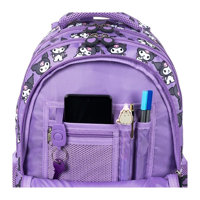 Ghiozdan pentru clasele I-IV, 4 compartimente, Majewski, Colectia Kuromi Violet, un ghiozdan modern si confortabil, de foarte buna calitate, finisat si decorat cu tehnologii avansate. Ghiozdanul este confectionat din materiale impermeabile, rezistente la uzura si inghet. Ghiozdanul este deosebit de incapator, cu o compartimentare excelenta, avand spatii pentru carti, caiete, accesorii si rechizite, asigurand astfel o foarte buna organizare. Prevazut cu un compartiment principal ce se inchide cu doua fermoare si trei compartimente frontale ce se inchid cu fermoar, ghiozdanul este deosebit de spatios si practic. Compartimentul principal este prevazut cu buzunar interior, pentru pastrarea si transportul tabletei. Unul din compartimentele frontale este dotat cu mai multe separatoare interi-oare (destinate articolelor precum chei, bani, memory-stick-uri, accesorii telefon, instrumente de scris sau alte obiecte importante de mici dimensiuni), precum si cu un breloc detasabil pentru cheie. Ghiozdanul este prevazut cu doua buzunare laterale cu plasa, ideale pentru a pastra recipientul cu apa. Ghiozdanul este dotat cu elemente reflectorizante pe partea din fata, pe laterale si pe bretele. Ghiozdanul este prevazut cu un maner buretat pentru a putea fi purtat si in mana. Spatele si bretelele sunt intarite si buretate cu un burete gros, oferindu-le fermitate si avand rolul de a proteja umerii si spatele. Spatele ghiozdanului este buretat ergonomic, dotat cu o zona de contact cu plasa, pentru o buna circulatie a aerului. Bretelele ghiozdanului sunt ajustabile, pentru ca acesta sa poata fi aranjat perfect pe spate. Fermoarele au zona de prindere cauciucata si profilata, pentru prindere usoara. Ba-za ghiozdanului are zone de contact cauciucate pentru protejare la umezeala. Dimensiunile ghi-ozdanului sunt urmatoarele: 40x28x18 cm.