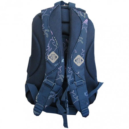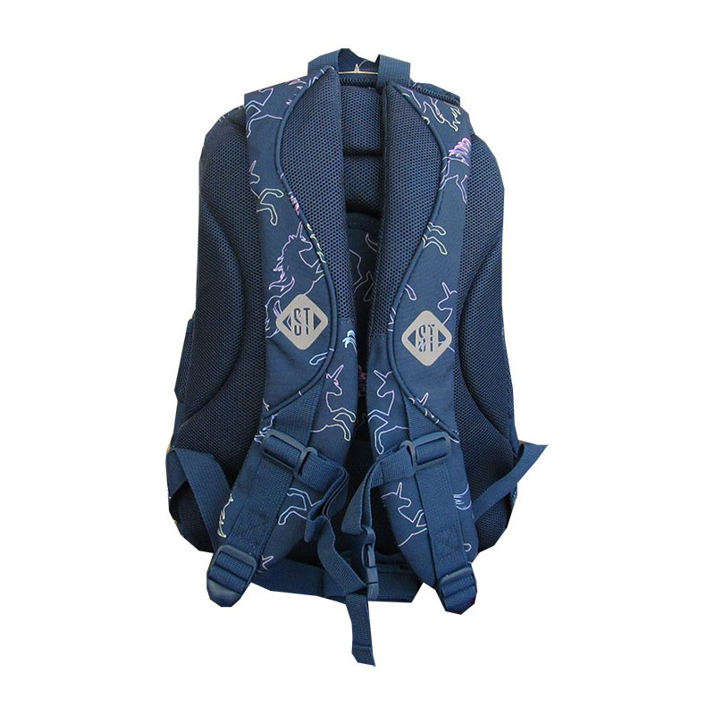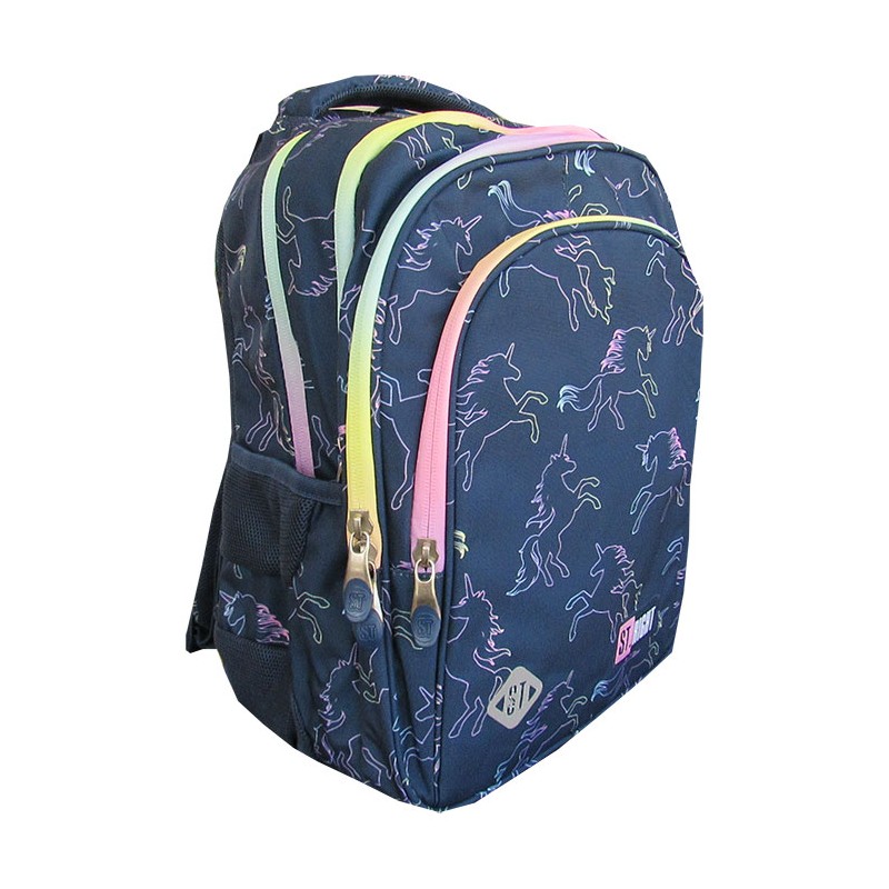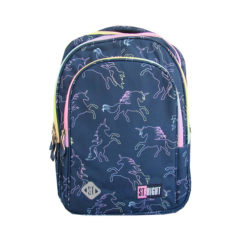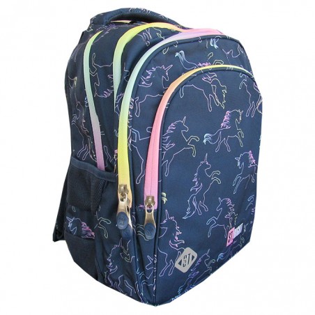 Ghiozdan pentru clasele I-IV, 4 compartimente, Majewski, Gama St. Right, Colectia Dream Unicorn, un ghiozdan modern si confortabil, de foarte buna calitate, finisat si decorat cu tehnologii avansate. Ghiozdanul este confectionat din materiale impermeabile, rezistente la uzura si inghet. Ghiozdanul este deosebit de incapator, cu o compartimentare excelenta, avand spatii pentru carti, caiete, accesorii si rechizite, asigurand astfel o foarte buna organizare. Prevazut cu un compartiment principal ce se inchide cu doua fermoare si trei compartimente frontale ce se inchid cu fermoar, ghiozdanul este deosebit de spatios si practic. Doua din cele trei compartimente frontale sunt prevazute cu cate 2 fermoare. Compartimentul principal al ghiozdanului este dotat cu un buzunar special captusit cu fleece pentru a pastra telefonul sau castile, un spatiu pentru personalizare (destinat pentru a nota numele, numarul de telefon si adresa de e-mail) si o iesire pentru casti. Unul din compartimentele frontale este dotat cu mai multe separatoare interioare (destinate articolelor precum chei, bani, memory-stick-uri, accesorii telefon, instrumente de scris sau alte obiecte importante de mici dimensiuni), precum si cu un breloc detasabil pentru cheie. Ghiozdanul este prevazut cu doua buzunare laterale cu plasa, ideale pentru a pastra recipientul cu apa. Ghiozdanul este dotat cu elemente reflectorizante pe partea din fata, pe laterale si pe bretele. Ghiozdanul este prevazut cu un maner buretat pentru a putea fi purtat si in mana. Spatele si bretelele sunt intarite si buretate cu un burete gros, oferindu-le fermitate si avand rolul de a proteja umerii si spatele. Spatele ghiozdanului este buretat ergonomic, dotat cu o zona de contact cu plasa, pentru o buna circulatie a aerului. Bretelele ghiozdanului sunt ajustabile, pentru ca acesta sa poata fi aranjat perfect pe spate. Fermoarele au zona de prindere cauciucata si profilata, pentru prindere usoara. Cheitele fermoarului compartimentului principal permit utilizarea unui lacat sau a unei criptari TSA. Baza ghiozdanului are zone de contact cauciucate pentru protejare la umezeala. Dimensiunile ghiozdanului sunt urmatoarele: 40x28x18 cm.