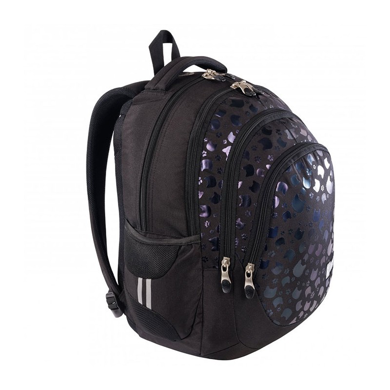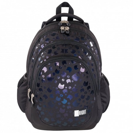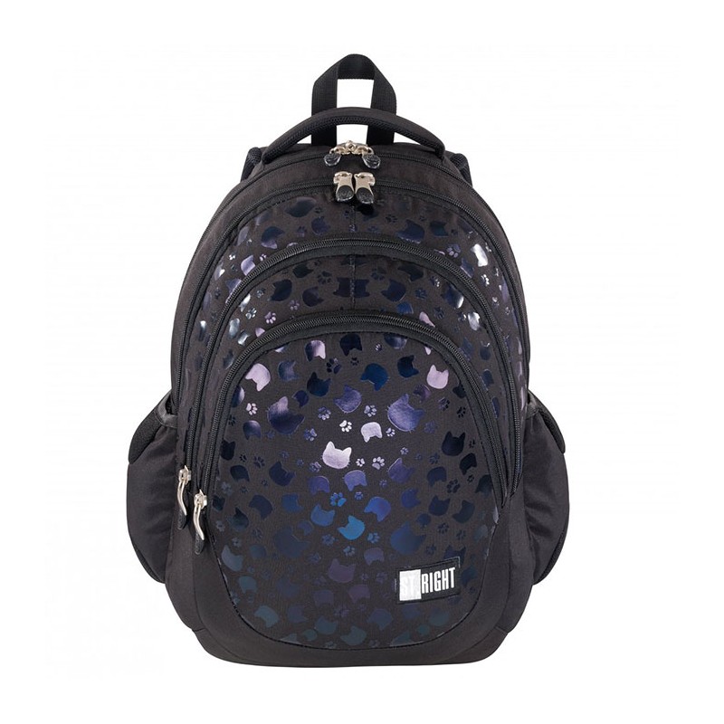 Ghiozdan pentru clasele V-VIII, 4 compartimente, Majewski, Gama St. Right, Colectia Black Cats, un ghiozdan modern si confortabil, de foarte buna calitate, finisat si decorat cu tehnologii avansate. Ghiozdanul este confectionat din materiale impermeabile, rezistente la uzura si inghet. Ghiozdanul este deosebit de incapator, cu o compartimentare excelenta, avand spatii pentru carti, caiete, accesorii si rechizite, asigurand astfel o foarte buna organizare. Prevazut cu un compartiment principal ce se inchide cu doua fermoare si trei compartimente frontale ce se inchid cu fermoar, ghiozdanul este deosebit de incapator si practic. Compartimentul principal al ghiozdanului este dotat cu un buzunar special captusit cu fleece pentru a pastra telefonul sau castile, un spatiu pentru personalizare (destinat pentru a nota numele, numarul de telefon si adresa de e-mail) si o iesire pentru casti. Unul din compartimentele frontale este dotat cu un buzunar pentru accesoriile telefonului, laptopului sau tabletei, precum alimentatoare, cabluri, mouse sau altele. Celalalt compartiment frontal este dotat cu mai multe separatoare interioare destinate articolelor precum chei, bani, memory-stick-uri, accesorii telefon, instrumente de scris, breloc detasabil pentru cheie sau alte obiecte importante de mici dimensiuni. Ghiozdanul este prevazut cu doua buzunare laterale cu plasa, ideale pentru a pastra recipientul cu apa. Ghiozdanul este dotat cu elemente reflectorizante pe laterale si pe bretele. Ghiozdanul este prevazut cu un maner buretat pentru a putea fi purtat si in mana. Spatele si bretelele sunt intarite si buretate cu un burete gros, oferindu-le fermitate si avand rolul de a proteja umerii si spatele. Spatele ghiozdanului este buretat ergonomic, dotat cu o zona de contact cu plasa, pentru o buna circulatie a aerului. Bretelele ghiozdanului sunt ajustabile, pentru ca acesta sa poata fi aranjat perfect pe spate. Ghiozdanul este dotat cu doua curele laterale pentru reglarea adancimii si mentinerea aspectului ghiozdanului. Fermoarele au zona de prindere cauciucata si profilata, pentru prindere usoara. Cheitele fermoarului compartimentului principal permit utilizarea unui lacat sau a unei criptari TSA. Baza ghiozdanului are zone de contact cauciucate pentru protejare la umezeala. Dimensiunile ghiozdanului sunt urmatoarele: 42x31x20 cm.