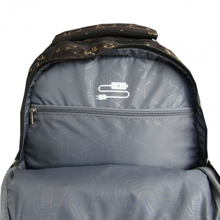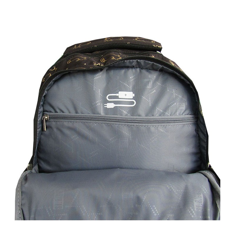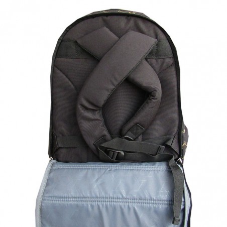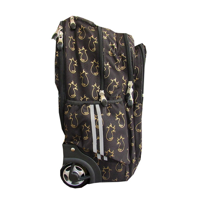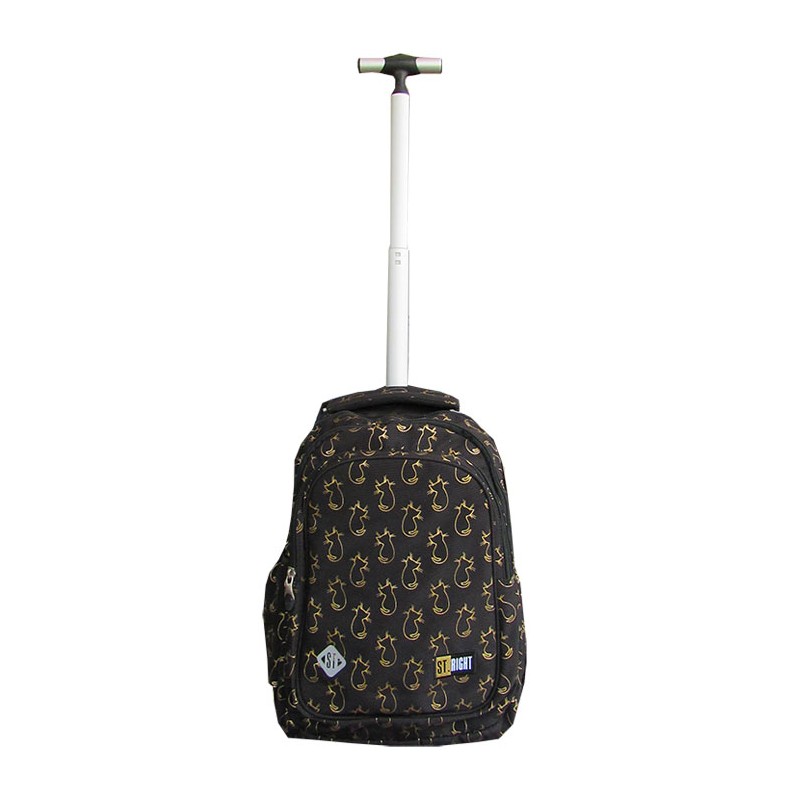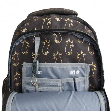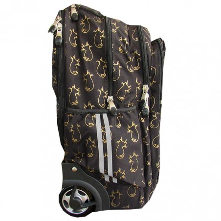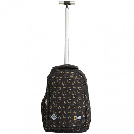 Ghiozdan cu troler Majewski Gama St. Right, Colectia Golden Cats, un ghiozdan modern si con-fortabil, de foarte buna calitate, finisat si decorat cu tehnologii avansate. Ghiozdanul este confec-tionat din materiale impermeabile, rezistente la uzura si inghet. Ghiozdanul poate fi folosit atat ca si troler, cat si ca un ghiozdan clasic. Ghiozdanul este deosebit de incapator, cu o compartimentare excelenta, avand spatii pentru carti, caiete, accesorii si rechizite, asigurand astfel o foarte buna or-ganizare. Prevazut cu un compartiment principal ce se inchide cu doua fermoare si doua comparti-mente frontale ce se inchid cu fermoar, ghiozdanul este deosebit de spatios si practic. Compartimen-tul principal al ghiozdanului este dotat cu doua buzunare speciale pentru pastrarea laptopului si a tabletei. Unul din compartimentele frontale ale ghiozdanului este dotat cu mai multe separatoare interioare (destinate articolelor precum chei, bani, memory-stick-uri, accesorii telefon, instrumente de scris sau alte obiecte importante de mici dimensiuni), precum si cu un breloc detasabil pentru cheie. Celalalt compartiment frontal este dotat cu un buzunar pentru accesoriile telefonului, lap-topului sau tabletei, precum alimentatoare, cabluri, mouse sau altele. Ghiozdanul este prevazut cu doua buzunare laterale cu elastic, ideale pentru a pastra recipientul cu apa. Ghiozdanul este prevazut cu un troler nedetasabil, care poate fi ascuns intr-un compartiment inchis cu fermoar, atunci cand ghiozdanul este purtat pe spate. Manerul telescopic din aluminiu este ergonomic si ajustabil in 2 pozitii (85 si 105 cm) adaptate la inaltimea copilului in crestere. Rotile ghiozdanului sunt robuste, silentioase, si se rotesc usor. Modificarea de la troler la ghiozdan si invers se face usor. Cand este utilizat ca troler, bretelele sunt ascunse de compartimentul dorsal. Compartimentul dorsal ofera un spatiu suplimentar de depozitare, atunci cand ghiozdanul se foloseste pe post de troler. Cand este utilizat ca si ghiozdan, panoul buzunarului asigura acoperirea rotilor. Ghiozdanul este prevazut in partea de jos cu un panou din plastic, pentru protejarea acestuia atunci cand este folosit pe post de troler, in timpul mersului sau la coborarea/urcarea scarilor. Tot in partea de jos a ghiozdanului se afla 2 picioruse, cu rolul de a oferi protectie si stabilitate ghiozdanului. Ghiozdanul este prevazut cu un maner buretat pentru a putea fi purtat si in mana. Spatele si bretelele sunt intarite si buretate cu un burete gros, oferindu-le fermitate si avand rolul de a proteja umerii si spatele. Bretelele ghi-ozdanului sunt ajustabile, pentru ca acesta sa poata fi aranjat perfect pe spate. Zona de contact cu spatele este captusita cu spuma. Fermoarele au zona de prindere cauciucata si profilata, pentru prin-dere usoara. Cheitele fermoarului compartimentului principal permit utilizarea unui lacat sau a unei criptari TSA. Dimensiunile ghiozdanului sunt urmatoarele: 44x32x20 cm (fara maner).