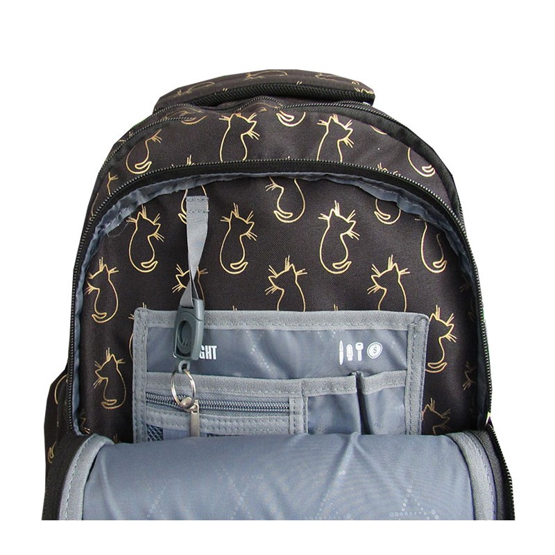 Ghiozdan cu troler Majewski Gama St. Right, Colectia Golden Cats, un ghiozdan modern si con-fortabil, de foarte buna calitate, finisat si decorat cu tehnologii avansate. Ghiozdanul este confec-tionat din materiale impermeabile, rezistente la uzura si inghet. Ghiozdanul poate fi folosit atat ca si troler, cat si ca un ghiozdan clasic. Ghiozdanul este deosebit de incapator, cu o compartimentare excelenta, avand spatii pentru carti, caiete, accesorii si rechizite, asigurand astfel o foarte buna or-ganizare. Prevazut cu un compartiment principal ce se inchide cu doua fermoare si doua comparti-mente frontale ce se inchid cu fermoar, ghiozdanul este deosebit de spatios si practic. Compartimen-tul principal al ghiozdanului este dotat cu doua buzunare speciale pentru pastrarea laptopului si a tabletei. Unul din compartimentele frontale ale ghiozdanului este dotat cu mai multe separatoare interioare (destinate articolelor precum chei, bani, memory-stick-uri, accesorii telefon, instrumente de scris sau alte obiecte importante de mici dimensiuni), precum si cu un breloc detasabil pentru cheie. Celalalt compartiment frontal este dotat cu un buzunar pentru accesoriile telefonului, lap-topului sau tabletei, precum alimentatoare, cabluri, mouse sau altele. Ghiozdanul este prevazut cu doua buzunare laterale cu elastic, ideale pentru a pastra recipientul cu apa. Ghiozdanul este prevazut cu un troler nedetasabil, care poate fi ascuns intr-un compartiment inchis cu fermoar, atunci cand ghiozdanul este purtat pe spate. Manerul telescopic din aluminiu este ergonomic si ajustabil in 2 pozitii (85 si 105 cm) adaptate la inaltimea copilului in crestere. Rotile ghiozdanului sunt robuste, silentioase, si se rotesc usor. Modificarea de la troler la ghiozdan si invers se face usor. Cand este utilizat ca troler, bretelele sunt ascunse de compartimentul dorsal. Compartimentul dorsal ofera un spatiu suplimentar de depozitare, atunci cand ghiozdanul se foloseste pe post de troler. Cand este utilizat ca si ghiozdan, panoul buzunarului asigura acoperirea rotilor. Ghiozdanul este prevazut in partea de jos cu un panou din plastic, pentru protejarea acestuia atunci cand este folosit pe post de troler, in timpul mersului sau la coborarea/urcarea scarilor. Tot in partea de jos a ghiozdanului se afla 2 picioruse, cu rolul de a oferi protectie si stabilitate ghiozdanului. Ghiozdanul este prevazut cu un maner buretat pentru a putea fi purtat si in mana. Spatele si bretelele sunt intarite si buretate cu un burete gros, oferindu-le fermitate si avand rolul de a proteja umerii si spatele. Bretelele ghi-ozdanului sunt ajustabile, pentru ca acesta sa poata fi aranjat perfect pe spate. Zona de contact cu spatele este captusita cu spuma. Fermoarele au zona de prindere cauciucata si profilata, pentru prin-dere usoara. Cheitele fermoarului compartimentului principal permit utilizarea unui lacat sau a unei criptari TSA. Dimensiunile ghiozdanului sunt urmatoarele: 44x32x20 cm (fara maner).