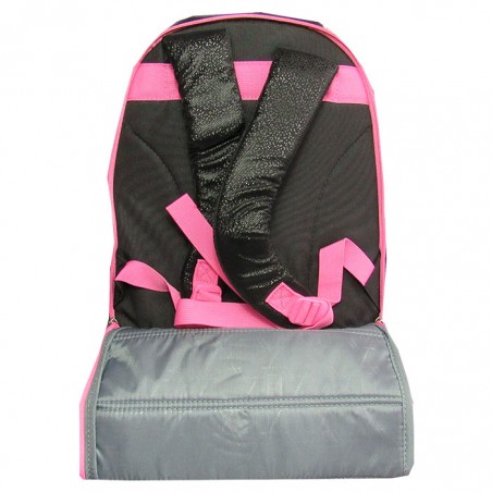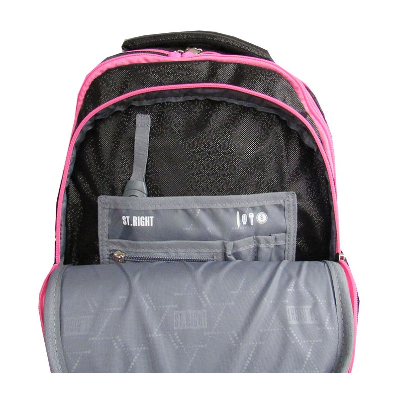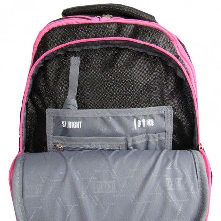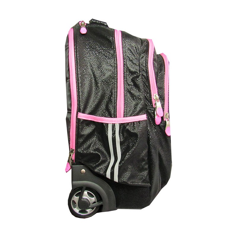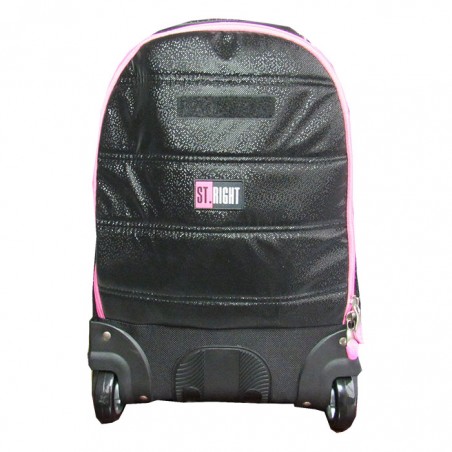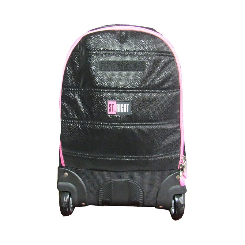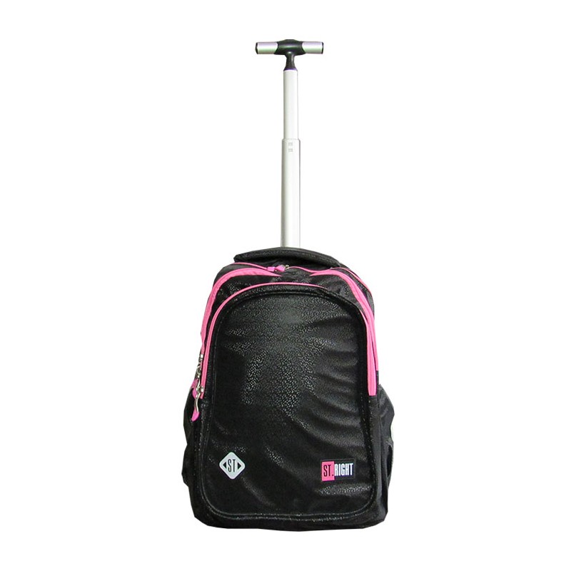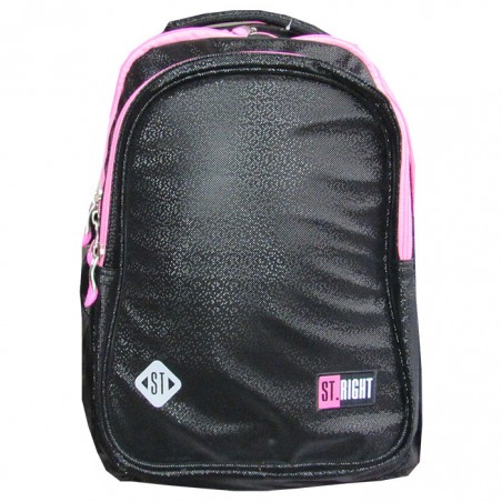 Ghiozdan cu troler Majewski Gama St. Right, colectia Black Glitter, un ghiozdan modern si confortabil, de foarte buna calitate, finisat si decorat cu tehnologii avansate. Ghiozdanul este confectionat din materiale impermeabile, rezistente la uzura si inghet. Ghiozdanul poate fi folosit atat ca si troler, cat si ca un ghiozdan clasic. Ghiozdanul este deosebit de incapator, cu o compartimentare excelenta, avand spatii pentru carti, caiete, accesorii si rechizite, asigurand astfel o foarte buna organizare. Prevazut cu un compartiment principal ce se inchide cu doua fermoare si doua compartimente frontale ce se inchid cu fermoar, ghiozdanul este deosebit de spatios si practic. Compartimentul principal al ghiozdanului este dotat cu doua buzunare speciale pentru pastrarea laptopului si a tabletei. Unul din compartimentele frontale ale ghiozdanului este dotat cu mai multe separatoare interioare (destinate articolelor precum chei, bani, memory-stick-uri, accesorii telefon, instrumente de scris sau alte obiecte importante de mici dimensiuni), precum si cu un breloc detasabil pentru cheie. Celalalt compartiment frontal este dotat cu un buzunar pentru accesoriile telefonului, laptopului sau tabletei, precum alimentatoare, cabluri, mouse sau altele. Ghiozdanul este prevazut cu doua buzunare laterale cu elastic, ideale pentru a pastra recipientul cu apa. Ghiozdanul este prevazut cu un troler nedetasabil, care poate fi ascuns intr-un compartiment inchis cu fermoar, atunci cand ghiozdanul este purtat pe spate. Manerul telescopic din aluminiu este ergonomic si ajustabil in 2 pozitii (85 si 105 cm) adaptate la inaltimea copilului in crestere. Rotile ghiozdanului sunt robuste, silentioase, si se rotesc usor. Modificarea de la troler la ghiozdan si invers se face usor. Cand este utilizat ca troler, bretelele sunt ascunse de compartimentul dorsal. Compartimentul dorsal ofera un spatiu suplimentar de depozitare, atunci cand ghiozdanul se foloseste pe post de troler. Cand este utilizat ca si ghiozdan, panoul buzunarului asigura acoperirea rotilor. Ghiozdanul este prevazut in partea de jos cu un panou din plastic, pentru protejarea acestuia atunci cand este folosit pe post de troler, in timpul mersului sau la coborarea/urcarea scarilor. Tot in partea de jos a ghiozdanului se afla 2 picioruse, cu rolul de a oferi protectie si stabilitate ghiozdanului. Ghiozdanul este prevazut cu un maner buretat pentru a putea fi purtat si in mana. Spatele si bretelele sunt intarite si buretate cu un burete gros, oferindu-le fermitate si avand rolul de a proteja umerii si spatele. Bretelele ghiozdanului sunt ajustabile, pentru ca acesta sa poata fi aranjat perfect pe spate. Zona de contact cu spatele este captusita cu spuma. Fermoarele au zona de prindere cauciucata si profilata, pentru prindere usoara. Cheitele fermoarului compartimentului principal permit utilizarea unui lacat sau a unei criptari TSA. Dimensiunile ghiozdanului sunt urmatoarele: 44x32x20 cm (fara maner).