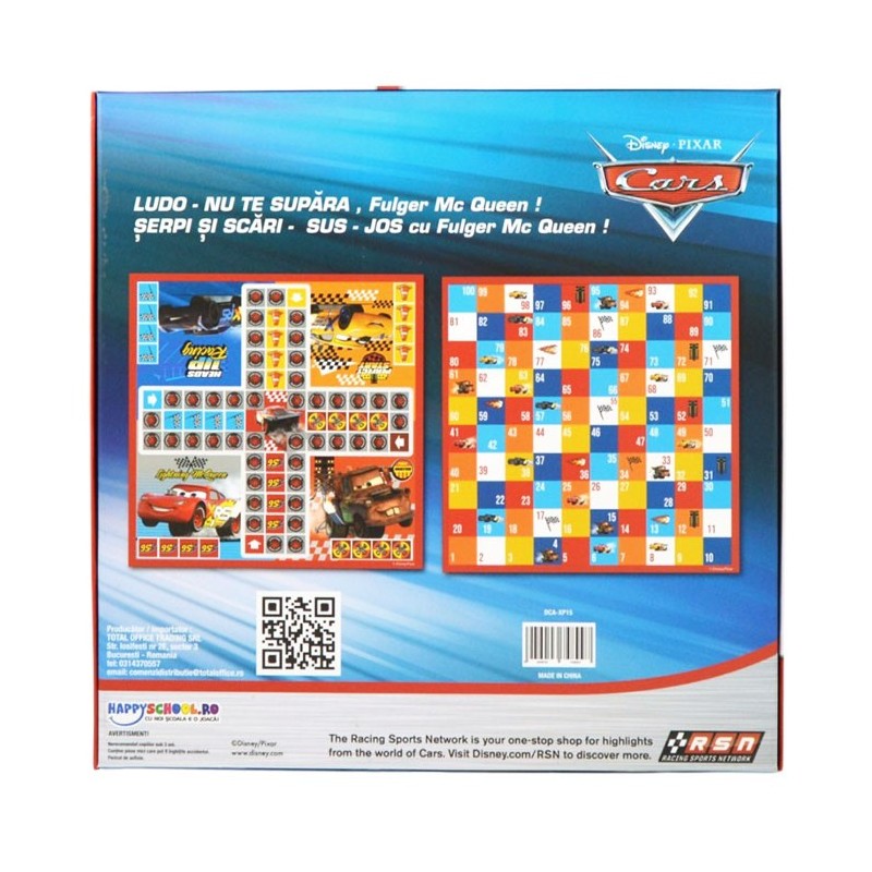 Joc de societate - Cars, un joc care dezvolta spiritul de competitie si abilitatile sociale. Jocurile de societate ajuta la dezvoltarea inteligentei, imaginatiei si a gandirii logice, oferind o distractie nemaipomenita pentru toata familia. Jocul contine: 2 table de joc, 16 pioni (cate 4 pioni in 4 culori diferite), un zar si 2 foi cu regulamentul de joc. Numar de jucatori: 2-4. Jocul este contraindicat copiilor mai mici de 3 ani. Se recomanda utilizarea produsului de catre copiii mai mari de 3 ani. Produsul poate fi curatat cu o carpa moale, uscata. Se recomanda ferirea produsului de umezeala si caldura excesiva. Dimensiunile cutiei sunt urmatoarele: 28.5x28.5x6.5 cm.