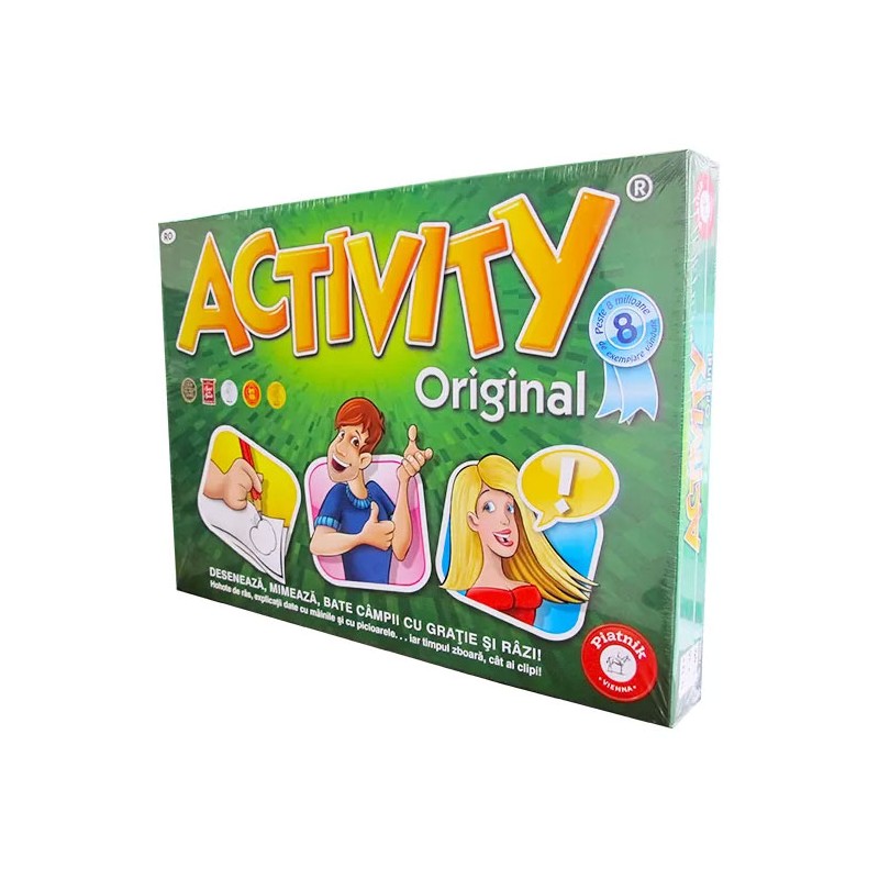 Joc de societate - Activity Orginal, un joc de societate si de indemanare, ce dezvolta atentia, perspicacitatea, memoria, spiritul de echipa, abilitatile de colaborare, asociere si indemanare. Jocurile de societate ajuta la dezvoltarea inteligentei si a gandirii logice, oferind o distractie nemaipomenita pentru toata familia. Jocul contine: o tabla de joc, 440 de carti cu cate 6 probleme de rezolvat, 1 clepsidra, 4 pioni si regulamentul de joc. Activity Original este un joc creativ si de comunicare, o combinatie de elemente: mima, descriere verbala si desen. Jucatorii individuali sau echipele incearca sa ghiceasca diferite cuvinte sau expresii, precum rasarit de soare sau razatoare de legume, si astfel sa inainteze pe traseul jocului. Jucatorii isi pot pune in evidenta personalitatea, capacitatile artistice, fantezia si indemanarea. Pe parcursul jocului, toata lumea va rade cu lacrimi. In plus, jocul de creativitate si de comunicare Activity Original s-a innoit. Dispunand acum de un nou regulament de joc si de 2640 de probleme noi, jocul a devenit mai distractiv si mai savuros. Scopul jocului este ca jucatorii sa-si ajute echipa sa treaca prima linia de sosire. Sarcina jucatorilor este de a prezenta problemele de pe carti prin desene, prin mimica, sau descriindu-le in cuvinte, in asemenea mod, incat coechipierii lor sa poata ghici notiunile cautate in intervalul de timp disponibil si echipa sa poata avansa pe tabla de joc. Daca jucatorul trebuie sa prezinte o problema prin desen, ii este interzis sa vorbeasca sau sa gesticuleze, are insa voie sa dea din cap afirmativ, indicand astfel rezolvarea corecta a unei parti din problema. Dar nu are voie sa scrie litere sau cifre. Cand jucatorul trebuie sa descrie o problema in cuvinte, ii este interzis sa pronunte cuvantul cautat, respectiv parti sau forme declinate/conjugate ale cuvantului vizat. Cand jucatorul trebuie sa prezinte notiunea cautata prin mimica, in cursul gesticularii nu are voie nici sa vorbeasca, nici sa scoata vreun sunet. Ii este interzis sa utilizeze in vreun fel obiectele din incapere, sau sa le arate. Are insa voie sa-si indice partile propriului corp sau propria imbracaminte, respectiv sa le utilizeze pe acestea in cursul gesticularii. O noua regula, datorita careia jocul devine si mai palpitant: dislocarea adversarului. Daca pionul uneia dintre echipe paseste pe un camp pe care stationeaza deja pionul unei echipe adverse, pionul stationat pe acel camp trebuie sa faca un pas inapoi. Numar de jucatori: 3-16. Jocul este contraindicat copiilor mai mici de 3 ani. Se recomanda utilizarea produsului de catre copiii mai mari de 12 ani. Produsul poate fi curatat cu o carpa moale, uscata. Se recomanda ferirea produsului de umezeala si caldura excesiva. Produsul este fabricat in Romania, in conformitate cu reglementarile EN71.