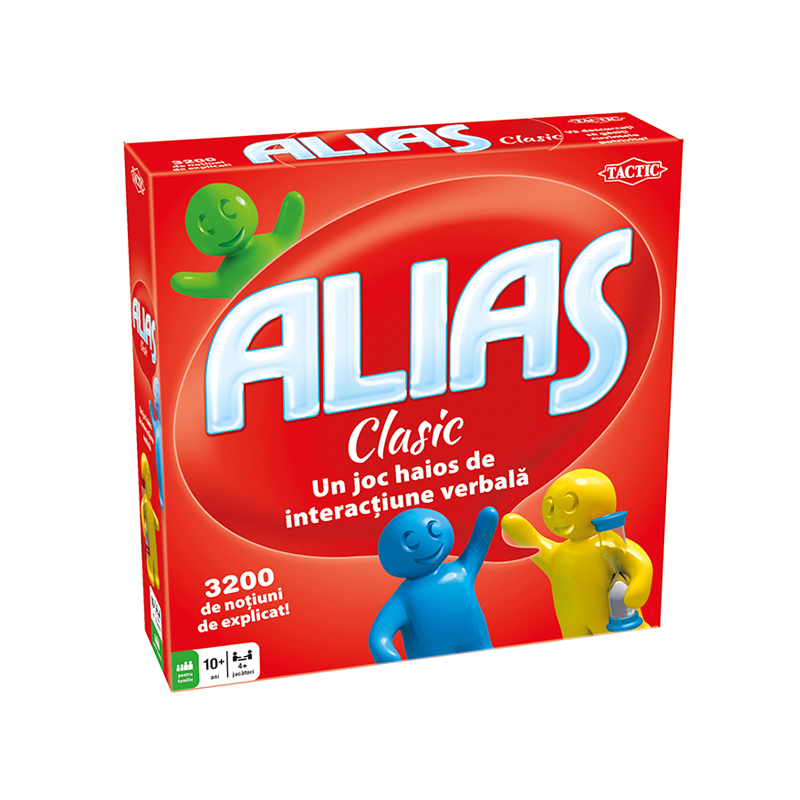 Joc de societate - Alias Clasic, un joc de societate si creativitate, ce dezvolta atentia, perspicacitatea, memoria, spiritul de echipa, abilitatile de colaborare si asociere, inteligenta si nu in ultimul rand, vocabularul, toate intr-un mod distractiv. Alias Clasic este versiunea originala a acestui joc amuzant si alert. Jocul contine: o tabla de joc, 400 de cartonase cu 3200 cuvinte, 1 clepsidra, 6 pioni si regulamentul de joc. Alias Clasic este un joc creativ de comunicare: jucatorii incearca sa explice cuvinte de pe cartonas coechipierilor, fara a rosti cuvantul propriu-zis. Scopul jocului este ca jucatorii sa-si ajute echipa sa treaca prima linia de sosire. Fiecare notiune ghicita inseamna un pas inainte. Jucatorii isi pot pune in evidenta personalitatea, capacitatile artistice, fantezia si indemanarea. Indiferent ca te joci cu prietenii, sau intr-o zi ploioasa cu familia, pe parcursul jocului, toata lumea va rade cu lacrimi. Numar minim de jucatori: 4. Jocul este contraindicat copiilor mai mici de 3 ani. Se recomanda utilizarea produsului de catre copiii mai mari de 10 ani. Produsul poate fi curatat cu o carpa moale, uscata. Se recomanda ferirea produsului de umezeala si caldura excesiva. Produsul este fabricat in Finlanda.