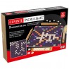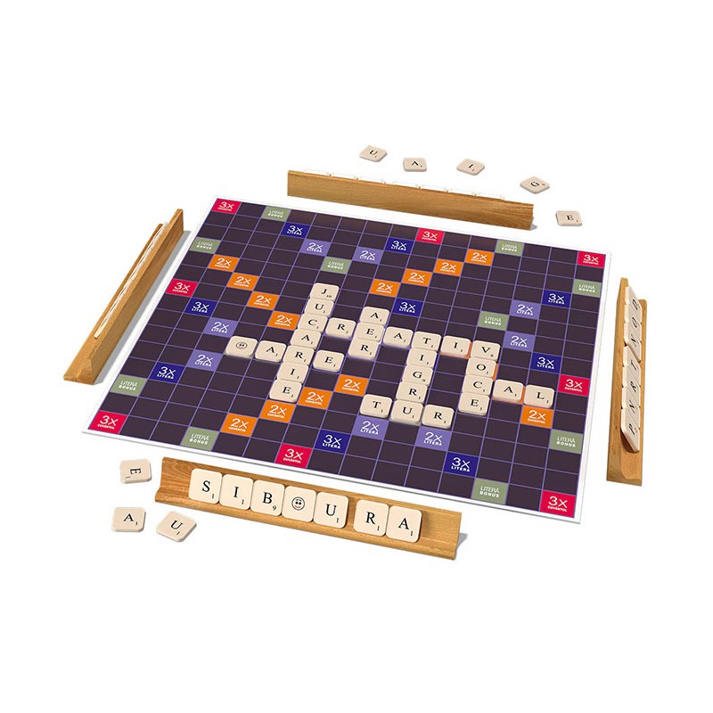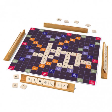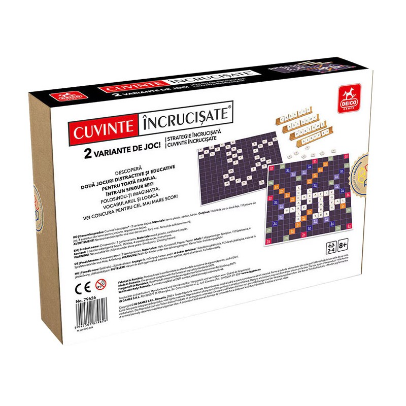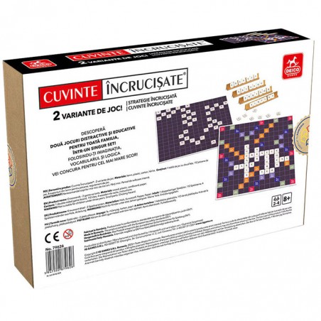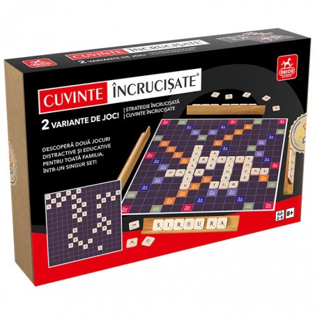 Joc de societate - Cuvinte incrucisate, doua variante de joc de cuvinte intr-un singur set, care iti vor pune la incercare atentia, spiritul de observatie si, nu in ultimul rand, vocabularul. Aceste jocuri vor oferi o distractie nemaipomenita pentru intreaga familie, in timp ce ajuta la dezvoltarea inteligentei, abilitatilor lingvistice si a gandirii logice si strategice. Cutia contine: o tabla de joc cu doua fete, 112 jetoane de joc inscrise cu literele alfabetului si anumite punctaje, 4 suporturi din lemn pentru jetoane si regulamentul de joc. Scopul jocului este de a castiga cat mai multe puncte prin plasarea pe tabla de joc a jetoanelor marcate cu litere, formand diverse cuvinte. Se pot forma cuvinte noi prin legarea cu cele asezate deja pe tabla. Intr-una dintre variante, pentru literele asezate pe campurile de rasplata, se primesc puncte bonus, in timp ce cealalta varianta nu are campuri de rasplata. Numar de jucatori: 2-4. Jocul este contraindicat copiilor mai mici de 3 ani. Se recomanda utilizarea produsului de catre copiii mai mari de 8 ani. Produsul poate fi curatat cu o carpa moale, uscata. Se recomanda ferirea produsului de umezeala si caldura excesiva. Produsul este fabricat in Romania in conformitate cu reglementarile EN71.