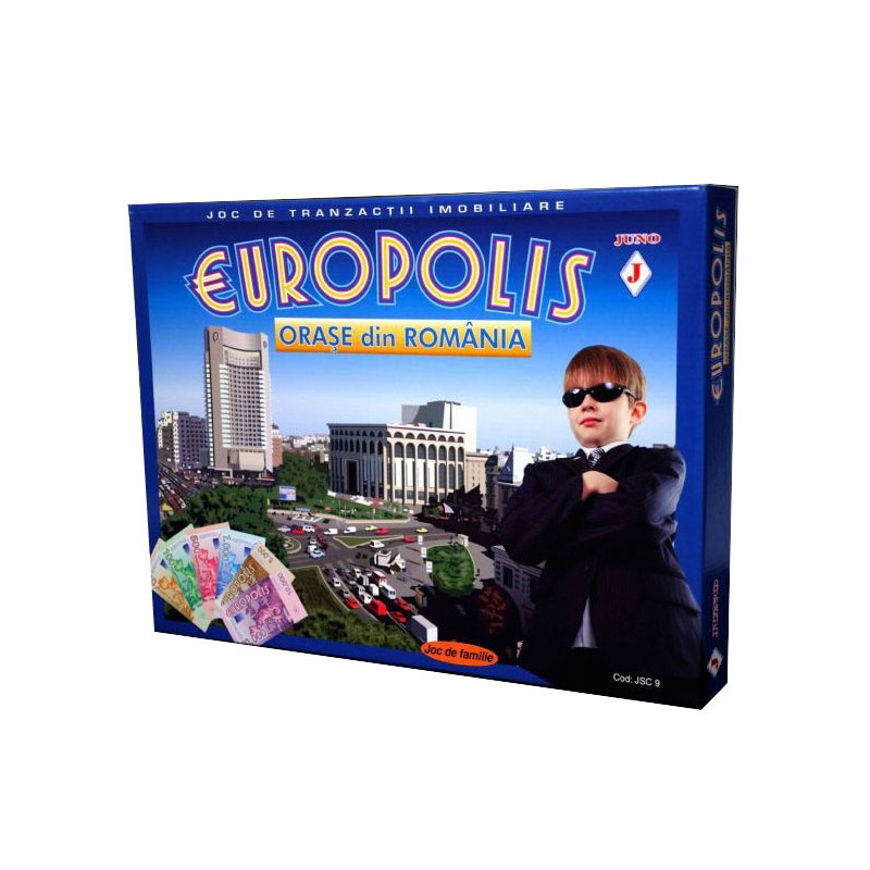 Joc de societate - Europolis Orase din Romania, un joc de tranzactii pentru viitori antreprenori, disponibil intr-o varianta alternativa cu orase din Romania. Jocurile de societate ajuta la dezvoltarea inteligentei, imaginatiei si a gandirii logice, oferind o distractie nemaipomenita pentru toata familia. Jocul contine o tabla de joc, pioni, zaruri, piese care reprezinta intreprinderi, stegulete, carduri si bani speciali. Numar de jucatori: 2-6. Europolis este un joc in care poti face tranzactii imobiliare in diverse orase din Romania: poti cumpara terenuri, vile si hoteluri care iti aduc venituri din chirii, sau poti deveni proprietarul unor drumuri sau unor utilitati (apa, electricitate), care de asemenea iti dau posibilitatea unor castiguri. Din cand in cand primesti sau platesti bani in banca. De asemenea, trebuie achitate diverse taxe si impozite. Pentru a castiga jocul trebuie sa devii cel mai bogat si ceilalti jucatori sa dea faliment. Jocul este contraindicat copiilor mai mici de 3 ani. Se recomanda utilizarea produsului de catre copiii mai mari de 8 ani. Produsul poate fi curatat cu o carpa moale, uscata. Se recomanda ferirea produsului de umezeala si caldura excesiva.