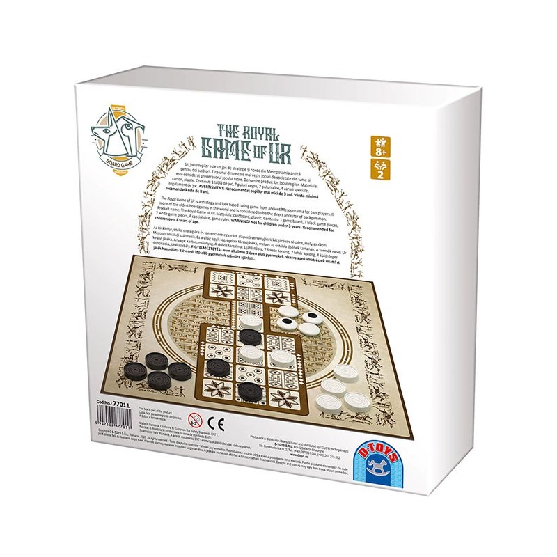 Ur, jocul regilor, un joc de strategie si noroc din Mesopotamia antica, considerat predecesorul bine-cunoscutului joc table, din zilele noastre. Primele exemplare ale jocului au fost descoperite intre anii 1922 si 1934, de catre arheologul britanic, Sir Leonard Wooley, in timpul excavarii Cimitirului Regal din Ur. Aceste exemplare dateaza in jurul anilor 3000 i.e.n. Regulile jocului, in schimb, au fost reconstituite abia la inceputul anilor 1980 de catre Irving Finkel, directorul Muzeului Britanic. Acesta a reusit sa traduca doua table de lut antice, care descriau cum se joaca acest joc. Variantele moderne ale jocului regilor se bazeaza pe aceasta traducere. Jocul de societate Ur ofera ore intregi de distractie, in timp ce dezvolta atentia, perspicacitatea, memoria, inteligenta si gandirea logica si strategica, precum si abilitatile sociale. Cutia contine o tabla de joc, 7 puluri negre, 7 puluri albe, 4 zaruri speciale si regulamentul de joc in limba romana, maghiara si engleza. Jocul se desfasoara intre 2 jucatori, pe o tabla cu patratele. Scopul jocului, precum si in cazul tablelor, este de a parcurge traseul pe tabla de joc cu toate piesele si de a le scoate afara inaintea adversarului. Tabla de joc ofera 6 casute "de siguranta" si 8 casute "de batalie", ceea ce asigura un joc intens si palpitant. Jocul este contraindicat copiilor mai mici de 3 ani. Se recomanda utilizarea produsului de catre copiii mai mari de 8 ani. Produsul poate fi curatat cu o carpa moale, uscata. Se recomanda ferirea produsului de umezeala si caldura excesiva. Produsul este fabricat in Romania in conformitate cu reglementarile EN71.