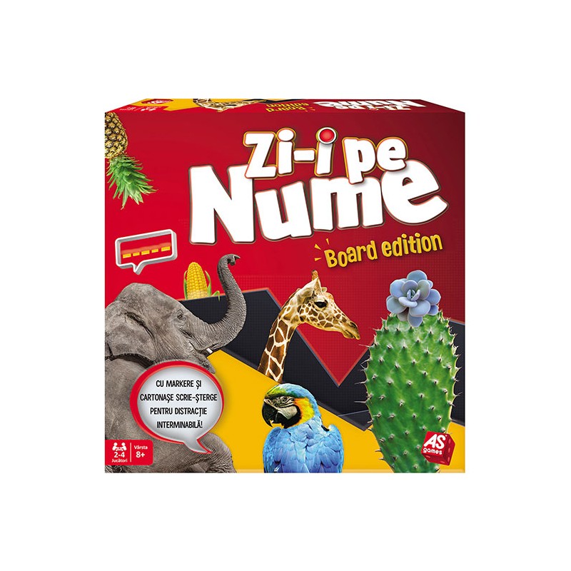 Joc de societate – Zi-i pe nume, un joc de familie si societate, ce dezvolta atentia, perspicacitatea, memoria, spiritul de echipa, abilitatile de colaborare si asociere, inteligenta si nu in ultimul rand, vocabularul, toate intr-un mod distractiv. Jocul contine: 4 cartonase scrie-sterge fata-verso, 4 markere cu buretel, 1 plansa scor, 24 de cartonase cu literele alfabetului, 50 cartonase cu categorii, 1 clepsidra si manualul de instructiuni. Exista 2 modalitati de joc. Jocul 1: Tomapan. Ia un cartonas si un marker! Gandeste-te si scrie pe cartonasul tau raspunsurile pentru litera pe care ai primit-o… STOP! Numaratai punctele obtinute si vedeti cine este cel mai bun! Jocul 2: Ai tu ultimul cuvant? Spune un cuvant din categoria aleasa si stergeti rapid litera de pe cartonas. Timpul se scurge rapid… Daca iti vine randul si nu te incadrezi in timp, obtii un punct (si nu vrem asta, pentru ca in acest joc punctele adunate nu sunt un lucru bun, avand conotatie negative). Imediat ce un jucator aduna 5 puncte, jocul se termina si jucatorul cu cele mai putine puncta castiga! Numar de jucatori: 2-4. Jocul este contraindicat copiilor mai mici de 3 ani. Se recomanda utilizarea produsului de catre copiii mai mari de 8 ani. Produsul poate fi curatat cu o carpa moale, uscata. Se recomanda ferirea produsului de umezeala si caldura excesiva.