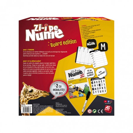Joc de societate – Zi-i pe nume, un joc de familie si societate, ce dezvolta atentia, perspicacitatea, memoria, spiritul de echipa, abilitatile de colaborare si asociere, inteligenta si nu in ultimul rand, vocabularul, toate intr-un mod distractiv. Jocul contine: 4 cartonase scrie-sterge fata-verso, 4 markere cu buretel, 1 plansa scor, 24 de cartonase cu literele alfabetului, 50 cartonase cu categorii, 1 clepsidra si manualul de instructiuni. Exista 2 modalitati de joc. Jocul 1: Tomapan. Ia un cartonas si un marker! Gandeste-te si scrie pe cartonasul tau raspunsurile pentru litera pe care ai primit-o… STOP! Numaratai punctele obtinute si vedeti cine este cel mai bun! Jocul 2: Ai tu ultimul cuvant? Spune un cuvant din categoria aleasa si stergeti rapid litera de pe cartonas. Timpul se scurge rapid… Daca iti vine randul si nu te incadrezi in timp, obtii un punct (si nu vrem asta, pentru ca in acest joc punctele adunate nu sunt un lucru bun, avand conotatie negative). Imediat ce un jucator aduna 5 puncte, jocul se termina si jucatorul cu cele mai putine puncta castiga! Numar de jucatori: 2-4. Jocul este contraindicat copiilor mai mici de 3 ani. Se recomanda utilizarea produsului de catre copiii mai mari de 8 ani. Produsul poate fi curatat cu o carpa moale, uscata. Se recomanda ferirea produsului de umezeala si caldura excesiva.